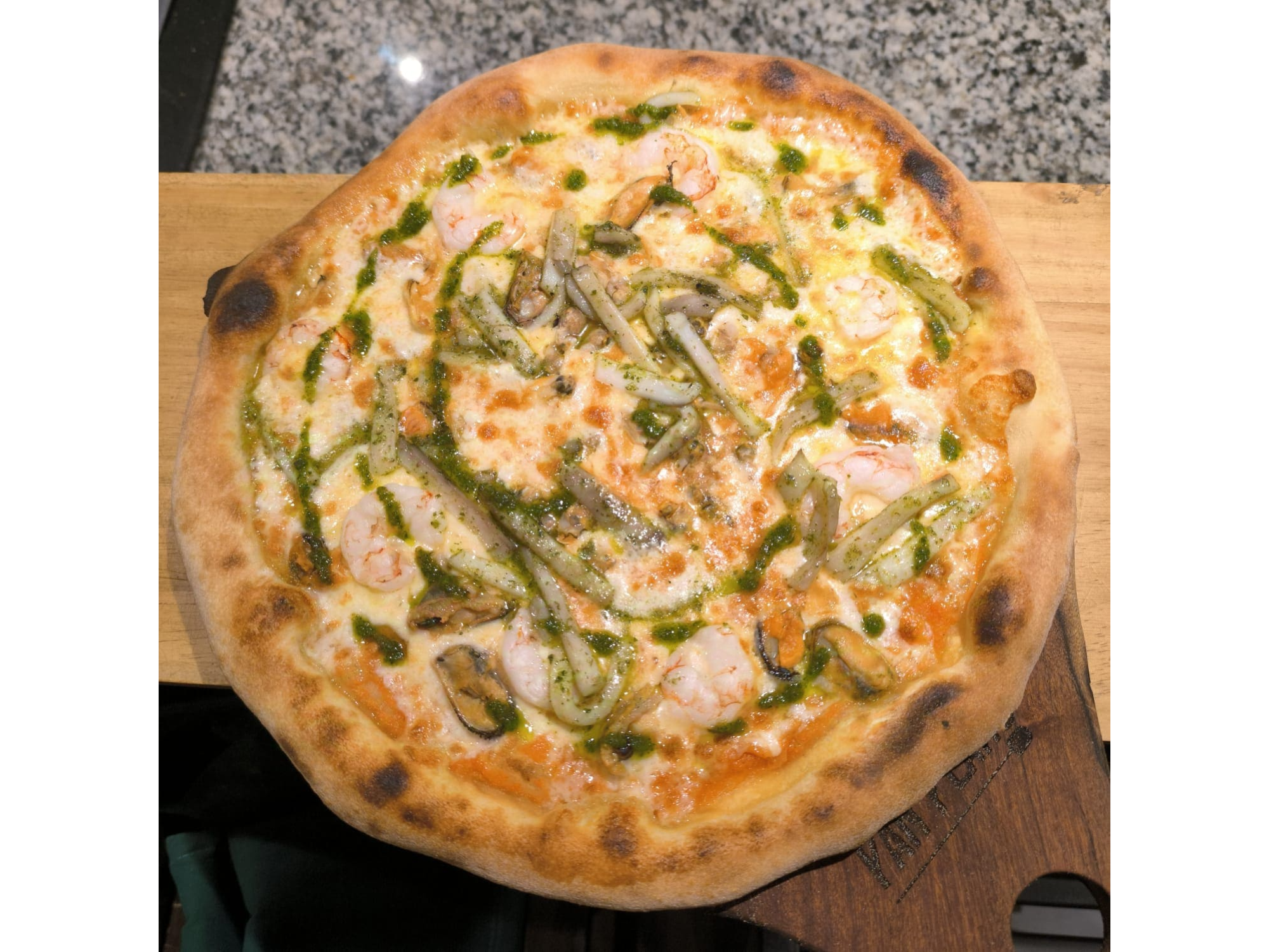 Salsa de tomate, muzza, calamar, mejillones, langostinos y provenzal.