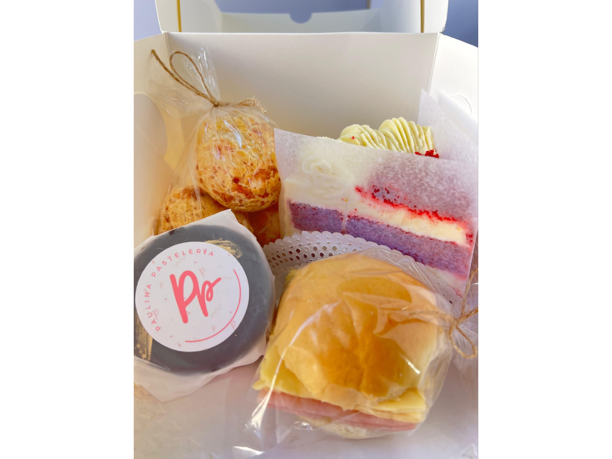 Box Feliz Día Compartir por WhatsApp Copiar enlace • Porción de torta Red Velvet • Alfajor tradicional de chocolate relleno de dulce de leche • 3 Chipás de queso • Chip de Jamón y Queso$15.000 Observaciones 0 / 150
