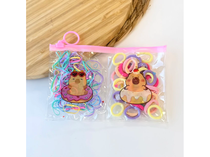 Incluye un monedero ideal para guardar sus cositas, acompañado de mini colitas de toalla y silicona, suaves y cómodas para el cabello.