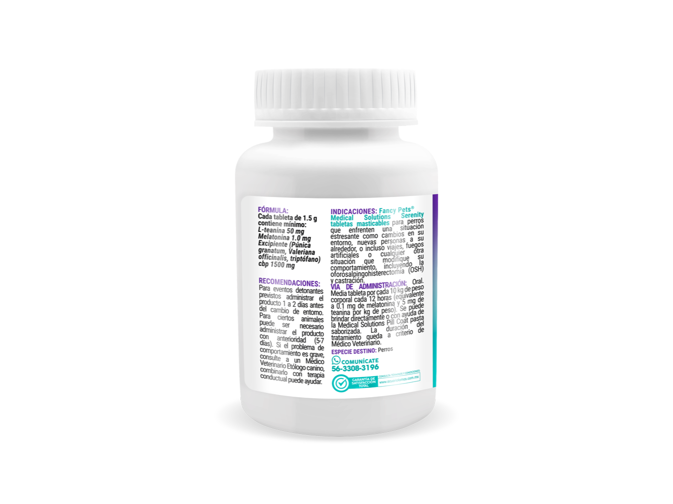 Fancy Pets® Medical Solutions Serenity tabletas masticables, para perros que enfrenten una situación estresante como cambios en su entorno, nuevas personas a su alrededor, o incluso viajes, fuegos artificiales o cualquier otra situación que modifique su comportamiento, incluyendo la oforosalpingohisterectomía (OSH) y castración.
