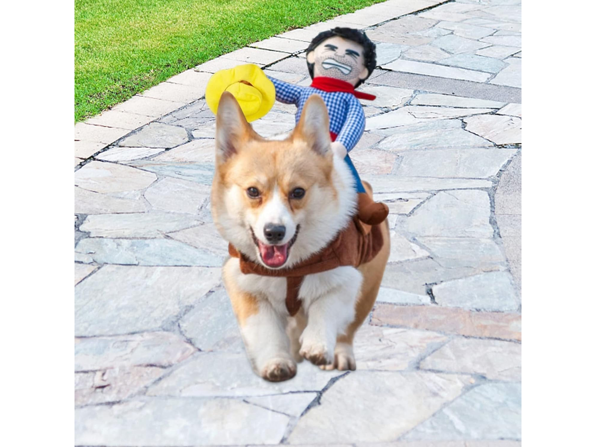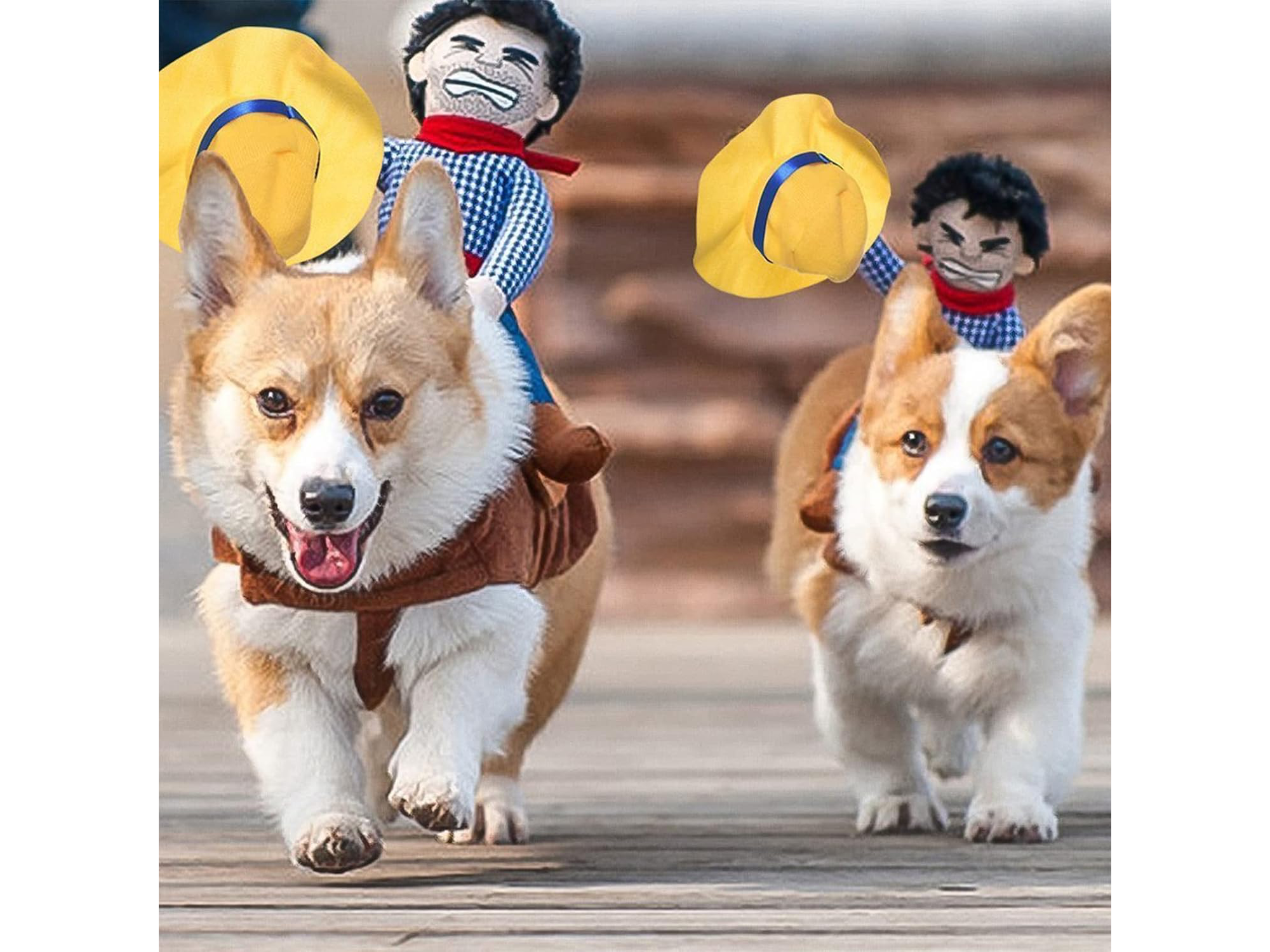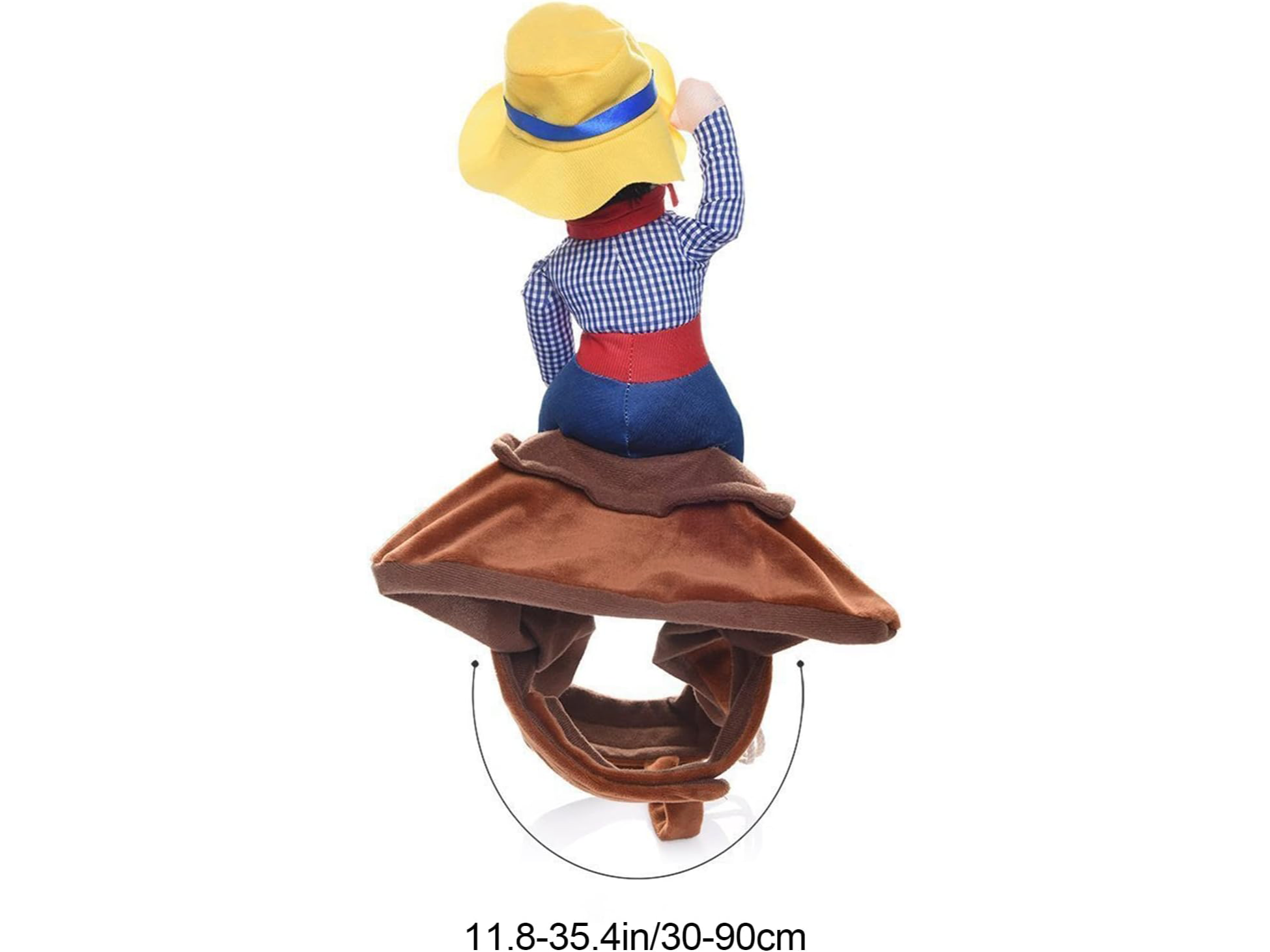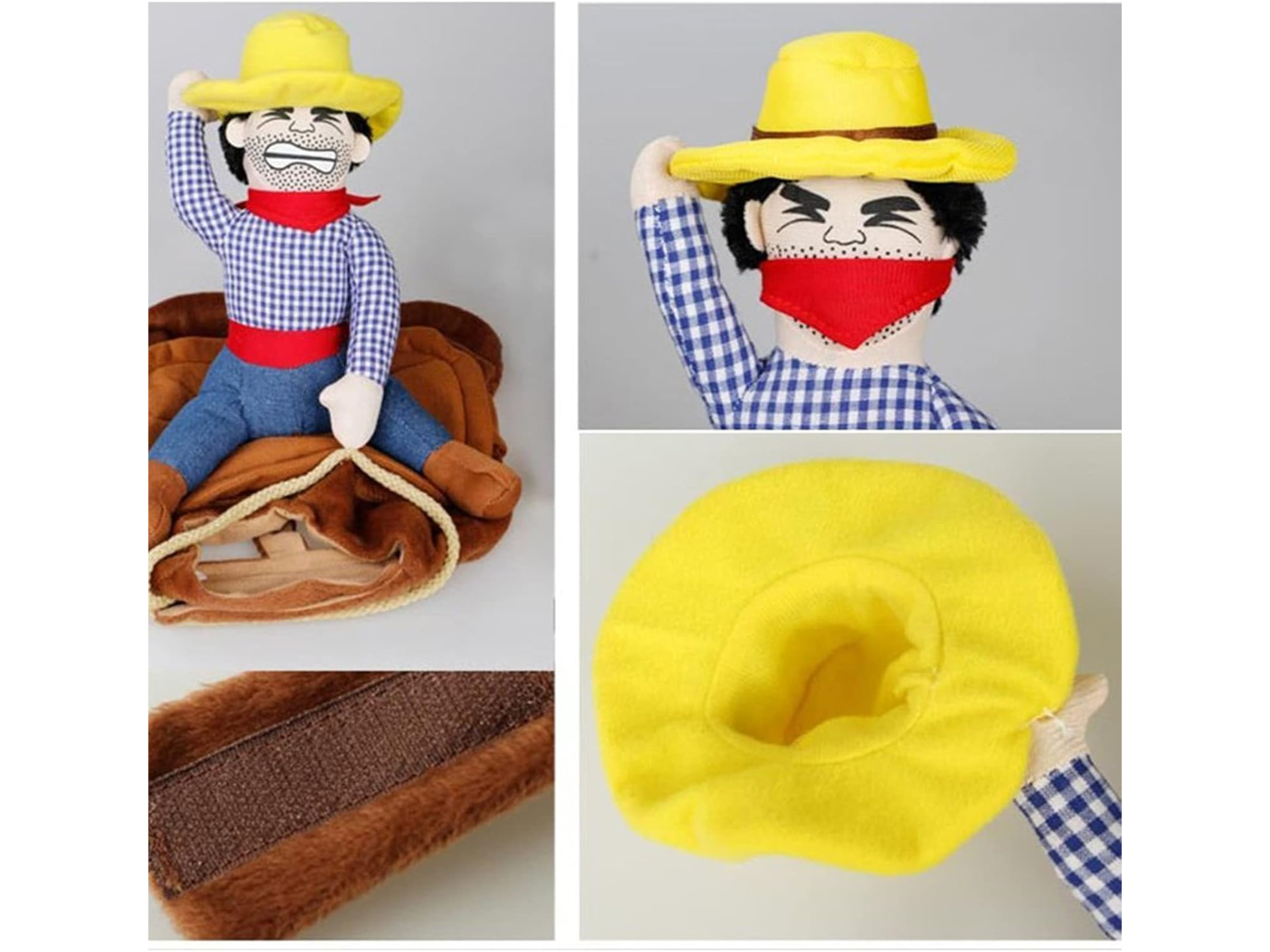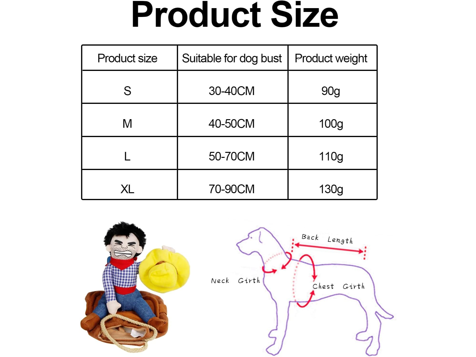 Descripciones: El traje de equitación para mascotas tiene un diseño de tela en forma de sillín que es más fácil de llevar para tu perro. El gancho y el cierre se pueden ajustar para el tamaño de la mascota para garantizar que el perro esté ajustado y cómodo. El disfraz de equitación para perros se puede enjuagar con agua directamente cuando está sucio. Especificaciones: Material: poliéster + algodón acolchado. S: Tamaño del pecho: 30-40 cm, aproximadamente 90 g. M: Tamaño del pecho: 40-50 cm, aproximadamente 100 g. L: Tamaño del pecho: 19.69-27.56 pulgadas, aproximadamente 110 g. XL: tamaño del pecho: 70-90 cm, aproximadamente 130 g. Lista de productos: 1 traje de vaquero para perros