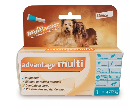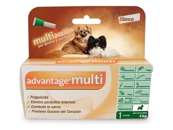 El anti pulgas Advantage Multi® de Elanco provee a tu perro una protección de amplio espectro contra los parásitos tan molestos. Con Advantage Multi puedes estar tranquilo de que tu perro se mantendrá libre de pulgas, gusano de corazón y parásitos intestinales. Con Advantage Multi desparasitas, eliminas pulgas y previenes el gusano de corazón en una sola toma.