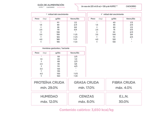 Durante los primeros meses de vida, los cachorros conocen el mundo a través de sus sentidos, por ello, es importante que tengan un sistema inmune que los proteja de microorganismos que puedan poner en riesgo su salud. Los perros de talla miniatura pueden llegar a ser nerviosos; por eso, NUPEC MR RAZAS MINI contiene Passiflora incarnata que puede ayudarles a disminuir el estrés. Los perros mini tienen una boca pequeña, por lo que necesitan un alimento diseñado con una croqueta que les permita masticarla adecuadamente.