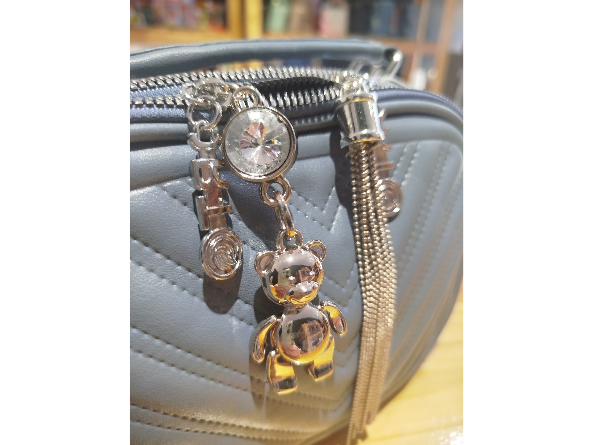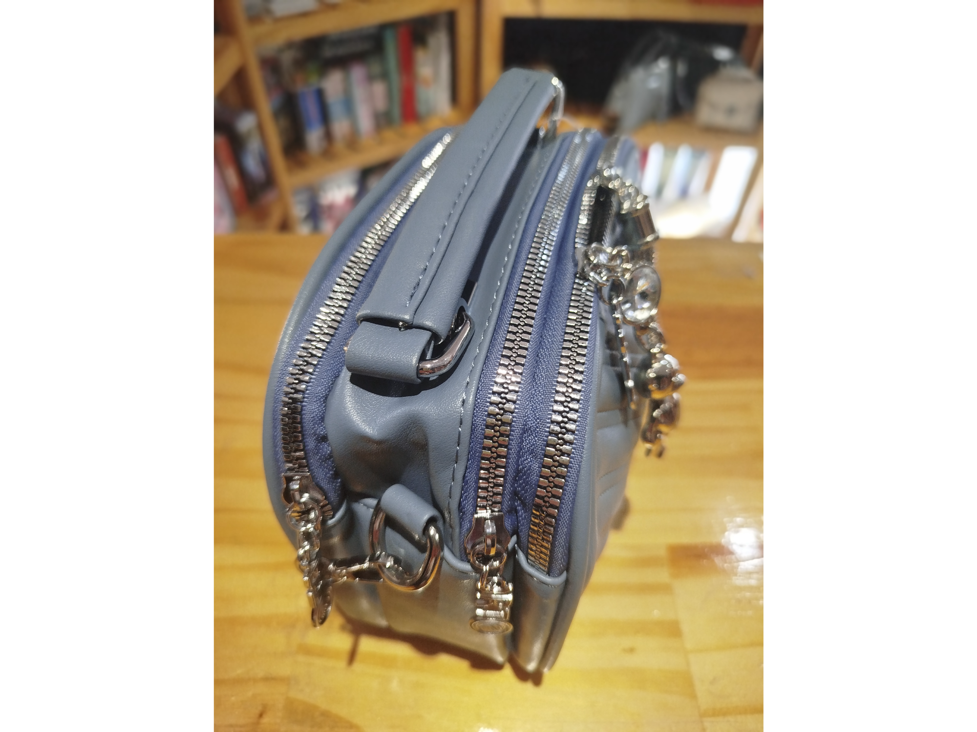 Bandolera osito Última unidad Ecocuero 3 cierres Correa larga con cadena y ecocuero Azul acero$32.000 Observaciones 0 / 150