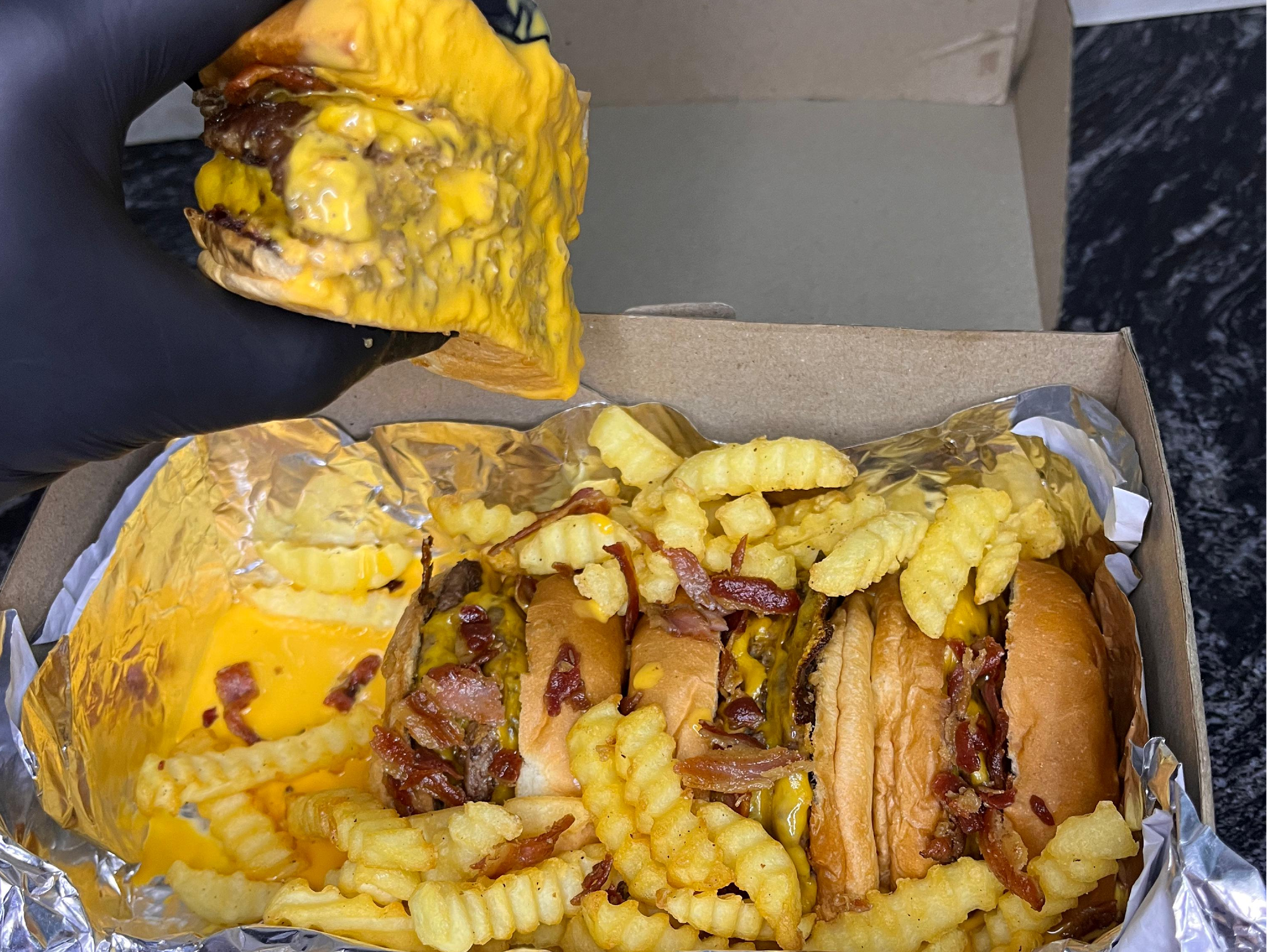BOX CHEDDAR Compartir por WhatsApp Copiar enlace DOS hamburguesas DOBLES con panceta y doble cheddar por medallón, colchón de cheddar, papas y panceta crocante picada$28.000 Observaciones 0 / 150