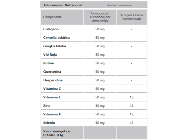 Cada comprimido contiene: Colágeno (50 mg), Centella Asiatica (50 mg), Ginkgo Biloba (40 mg), Vid roja (33 mg), Rutina (25 mg), Quercetina (25 mg), Hesperidina (25 mg), Vitamina C (8 mg, 18% IDR), Vitamina E (4 mg, 40% IDR), Zinc ( 1.4 mg, 20% IDR), Vitamina K (225 mcg, 346 % IDR), Selenio (13 mcg, 38% IDR).