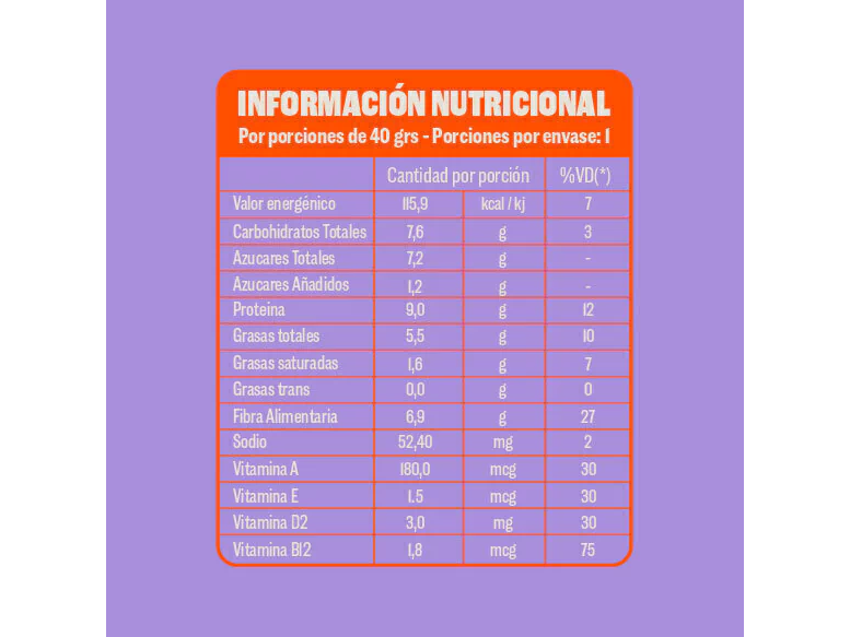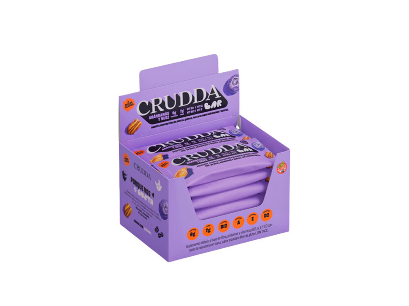Barrita de arandano, chocolate y el toque crujiente de la nuez, combinados con la proteína de arveja y soja, quinoa pop, pasta y harina de maní, pasas de uva y un baño de chocolate semi amargo como toque final.