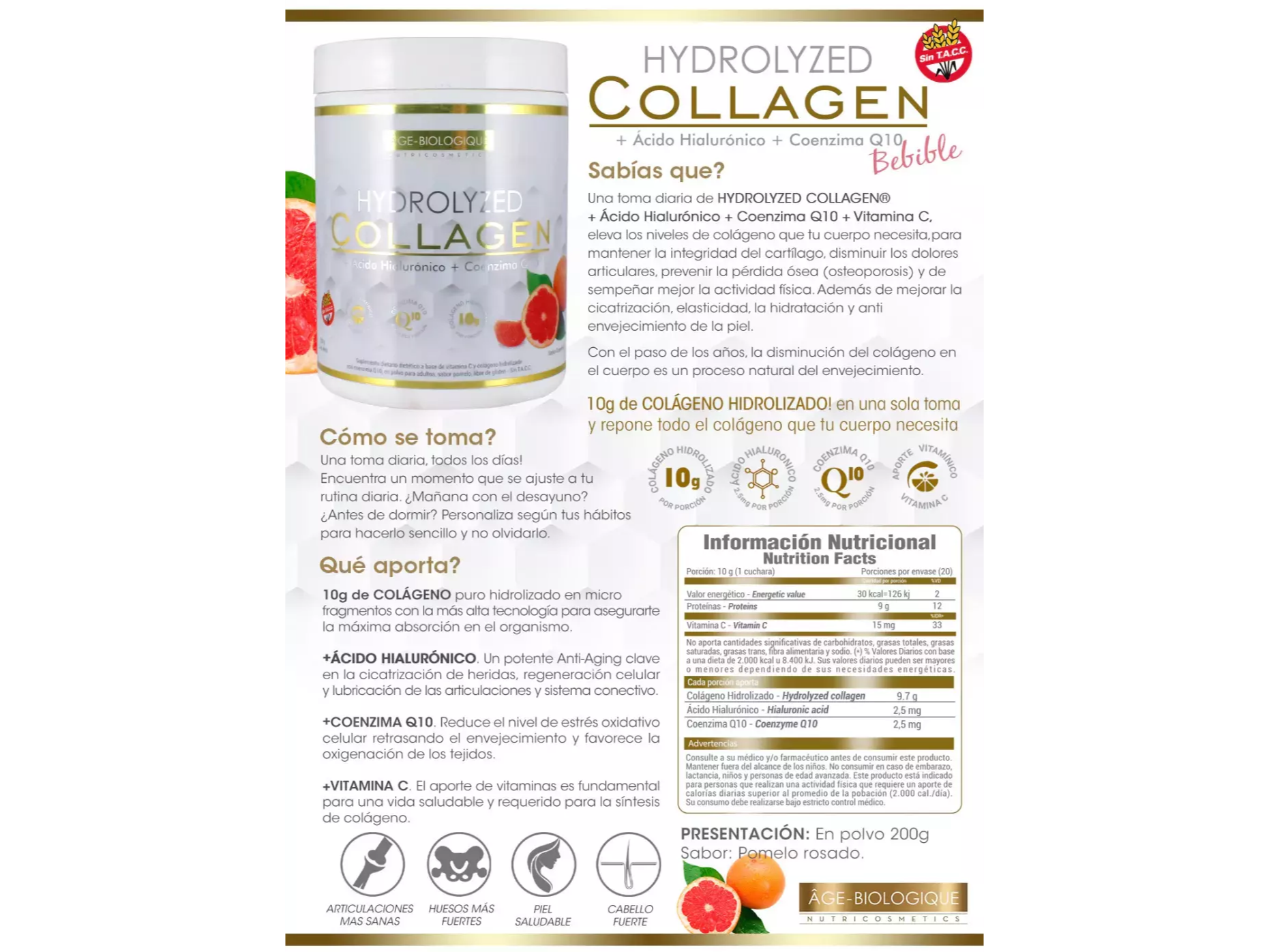 Un mix completo para la salud de piel y articulaciones. Su fórmula combina colágeno hidrolizado con ácido hialurónico, coenzima Q10 y vitamina C, potenciando la hidratación, elasticidad y protección antioxidante.