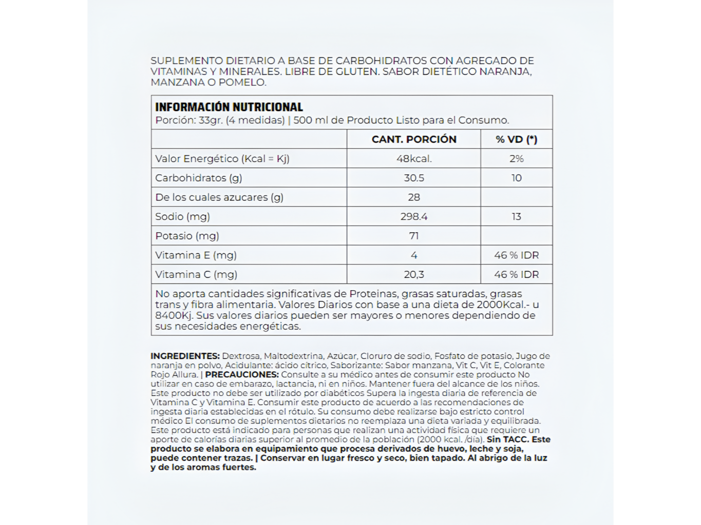 Hydromax Sport Drink – Nutremax (600 g, rinde 9 L) Compartir La bebida isotónica ideal para mantener la hidratación y energía durante y después del entrenamiento. Su fórmula rápida absorción ayuda a prevenir la deshidratación, mejorar la resistencia y acelerar la recuperación. Beneficios principales: Reposición de electrolitos y líquidos esenciales. Mejora la resistencia durante ejercicios prolongados. Evita calambres y fatiga muscular. Favorece la recuperación post-entrenamiento. Modo de uso: Disolver 4 dosificadores en 500ml de agua para obtener 1 bebida isotónica. Presentaciones Seleccioná las opciones que quieras.POMELO$19.500NARANJA 17600 $19.500 Observaciones 0 / 150