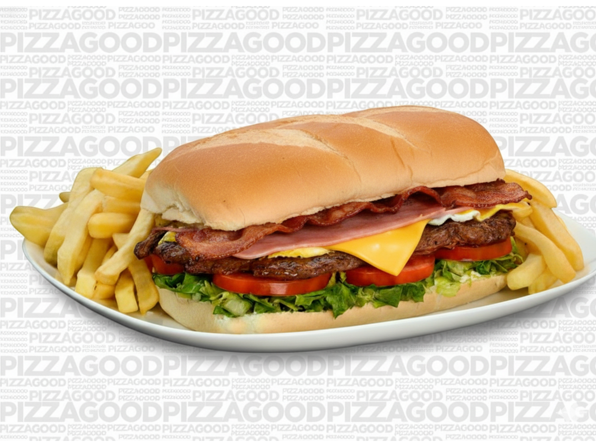Pan de lomo, mayonesa, mostaza, lechuga, tomates, bife de lomo, jamón, queso cheddar, bacon, queso danbo, huevo y papas fritas