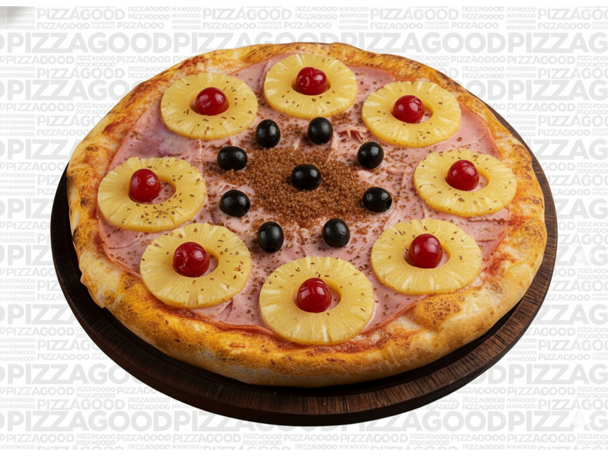 Masa casera, salsa de tomate natural, jamón cocido, mozzarella, rodajas de ananá, cerezas, azúcar negra, orégano y aceitunas negras.