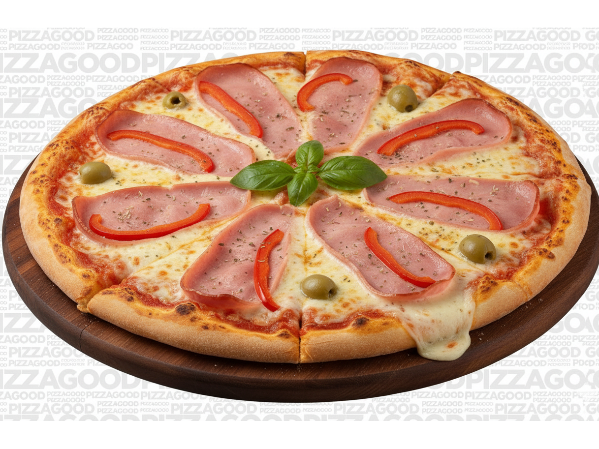 Masa casera, salsa de tomate natural, mozzarella, jamón cocido, Morrones, orégano y aceitunas verdes.