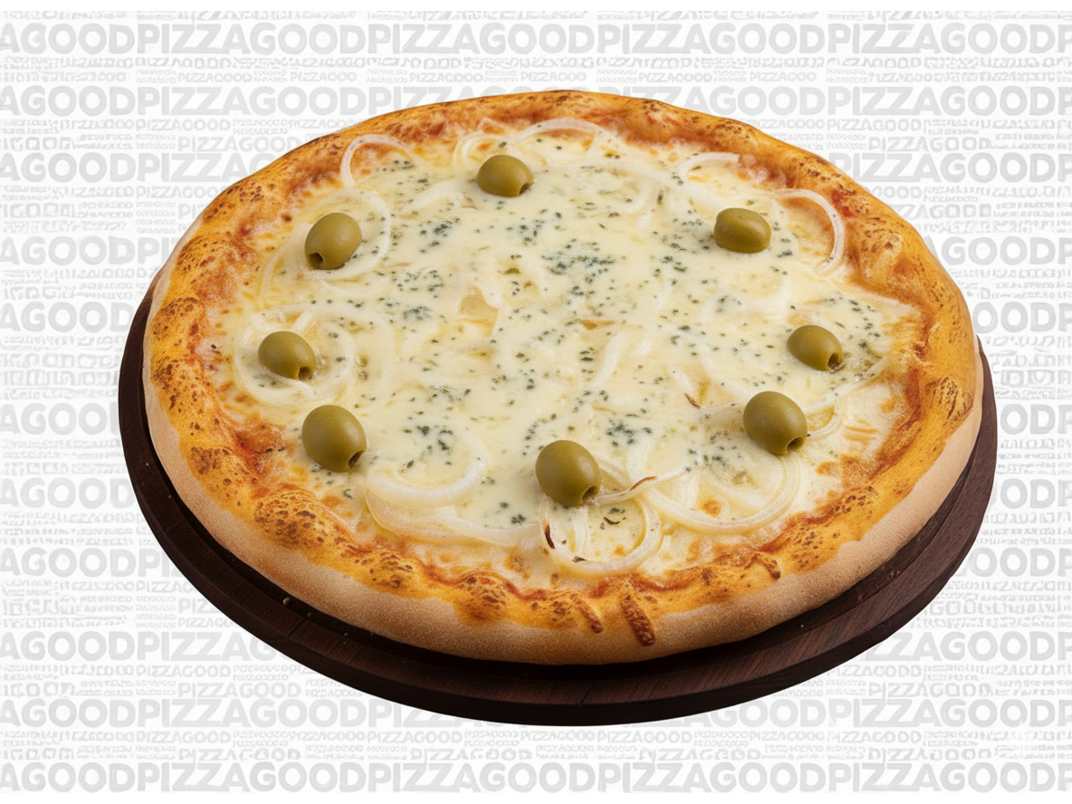 Masa casera, salsa de tomate natural, mozzarella, cebolla, roquefort, oliva, orégano y aceitunas verdes.