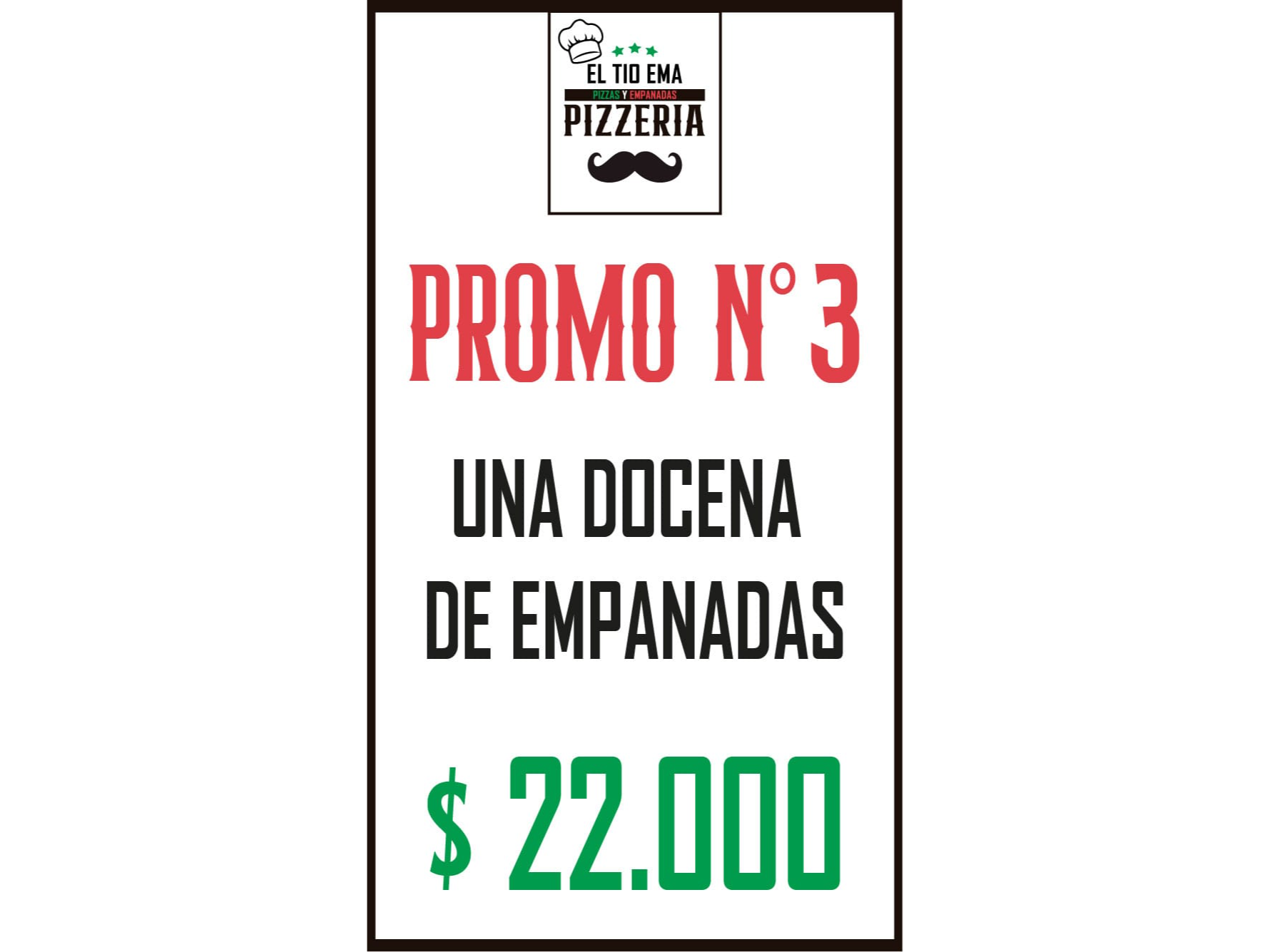 Promociones Compartir por WhatsApp Copiar enlace 12 empanadas $22.000 1 pizza y 4 empanadas $18.000 2 pizzas muzarella $22.000 3 pizzas muzarellas $33.000 1 pizza de muzzarella y una pizza de jamón $23.000 una pizza muzzarella y una pizza napolitana $23.000