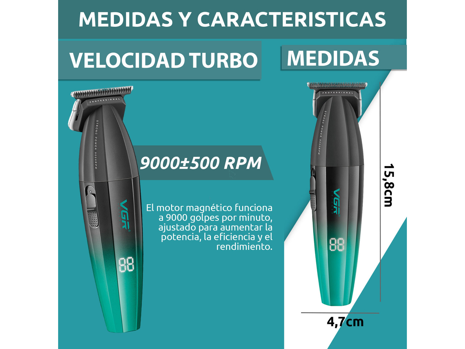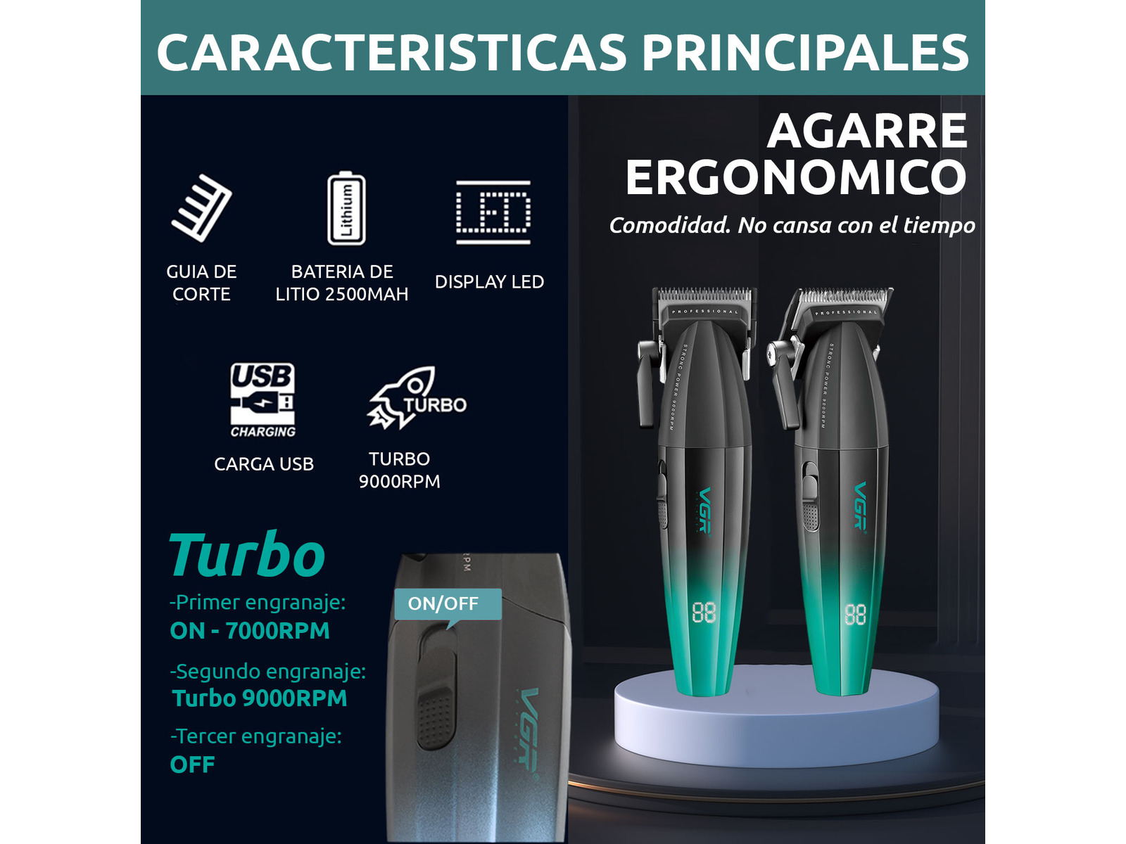La VGR V-003 es una cortadora profesional diseñada para barberos que buscan potencia, precisión y larga duración de batería. Equipada con un motor Turbo de hasta 9000 RPM, permite cortar todo tipo de cabello de forma rápida y uniforme, ideal para cortes completos y degradados.  Cuenta con cuchillas profesionales de cerámica y pulvimetalurgia, que ofrecen mayor precisión, menor fricción y mejor durabilidad, manteniendo el filo durante largas jornadas de trabajo.  Su batería de litio de 2500 mAh proporciona hasta 250 minutos de autonomía, permitiendo trabajar durante varias sesiones sin interrupciones.  Además incorpora pantalla LED digital, que muestra el nivel de batería y el estado de funcionamiento para tener siempre control del equipo.  ⸻ Características principales ✔ Motor Turbo de 9000 RPM de alta potencia ✔ Cuchillas de cerámica de alta precisión ✔ Pantalla LED con indicador de batería ✔ Batería de litio 2500 mAh ✔ Hasta 250 minutos de autonomía ✔ Carga rápida USB-C ✔ Uso con cable o inalámbrico ✔ Ideal para barbería profesional y fades ⸻ Especificaciones técnicas • Marca: VGR • Modelo: V-003 • Tipo: Cortadora profesional de cabello • Motor: rotativo turbo • Velocidad: hasta 9000 RPM • Potencia: 7 W • Batería: litio 2500 mAh • Autonomía: hasta 250 minutos • Tiempo de carga: aprox. 3 horas • Voltaje: 100-240 V / USB-C • Material del cuerpo: metal • Peso aproximado: 255-330 g  ⸻ Ajuste de corte La máquina cuenta con palanca de ajuste lateral y peines guía para diferentes largos. Rango de corte aproximado: • Sin peine: 0.5 mm – 2.5 mm • Con peines: hasta 12 mm  Peines incluidos: 1.5 mm – 3 mm – 4.5 mm – 6 mm – 9 mm – 12 mm  ⸻ Contenido del paquete • 1 Máquina VGR V-003 • 6 Peines guía • Cable de carga USB-C • Cepillo de limpieza • Aceite lubricante • Manual de usuario