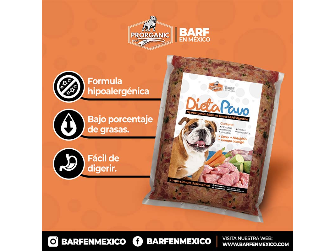 Alimento Crudo Biologicamente apto para tu Mascota. Elaborado con la Calidad y Responsabilidad a tal grado que tiene calidad para consumo humano, con ingredientes como Hueso Carnoso Triturado de Pavo, Vísceras y Trozos de Mùsculo y Carne de Cordero, Pavo. Verduras como calabaza, zanahoria, espinaca y acelga. Recibe en la comodidad de tu casa y consiente a tu mascota dándole lo que siempre debio haber comido y no te preocupes, ya que al estar empacado al vacio y bajo congelación no tendrás ningun problema para su mantenimiento.