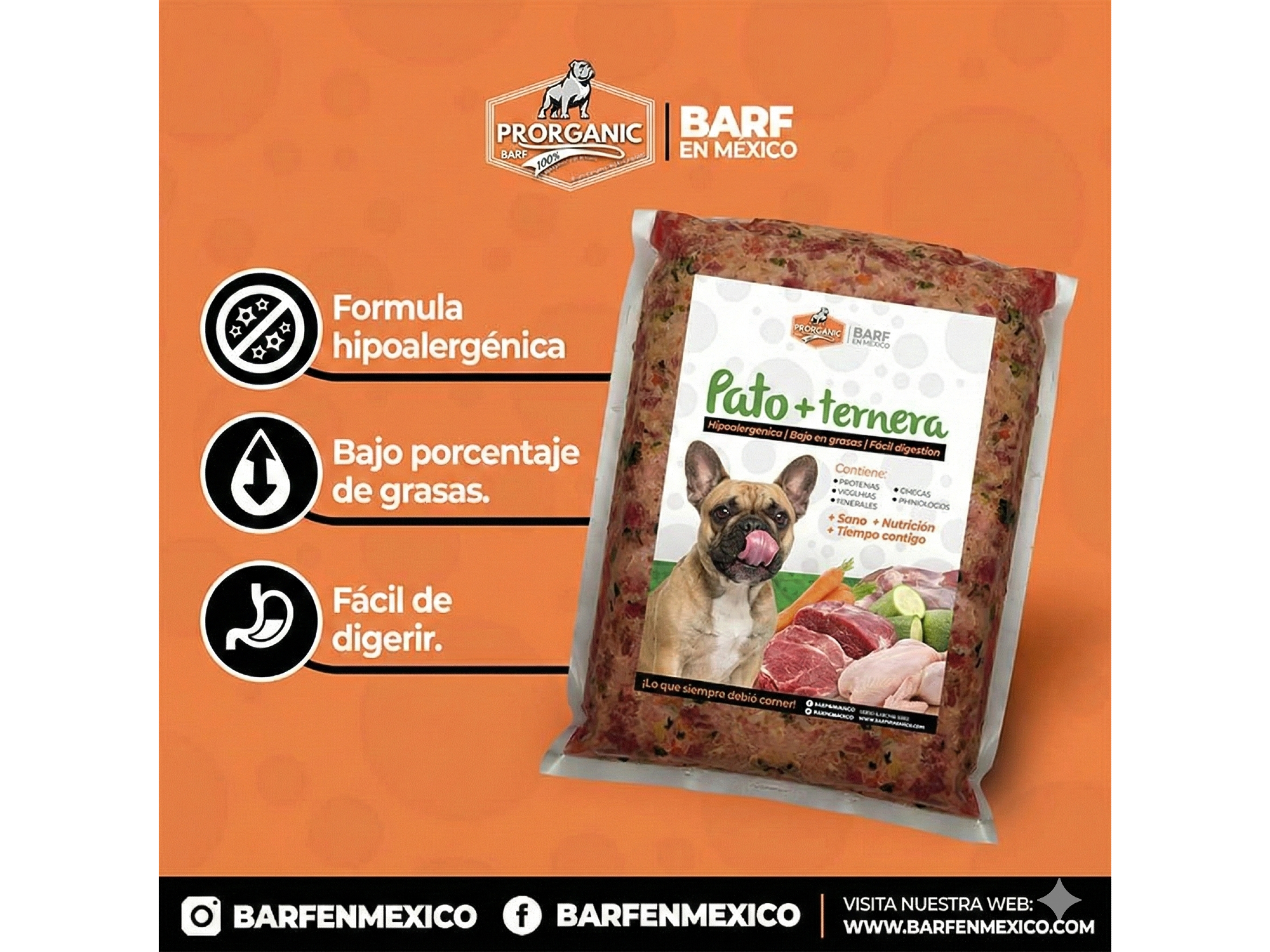 Alimento Crudo Biologicamente apto para tu Mascota. Elaborado con la Calidad y Responsabilidad a tal grado que tiene calidad para consumo humano, con ingredientes como Carne de Pavo, Carne de Pato, Músculo de Ternera, Vísceras. Verduras como calabaza, zanahoria, espinaca y acelga. Adicionado con Espirulina Recibe en la comodidad de tu casa y consiente a tu mascota dándole lo que siempre debio haber comido y no te preocupes, ya que al estar empacado al vacio y bajo congelación no tendrás ningun problema para su mantenimiento.