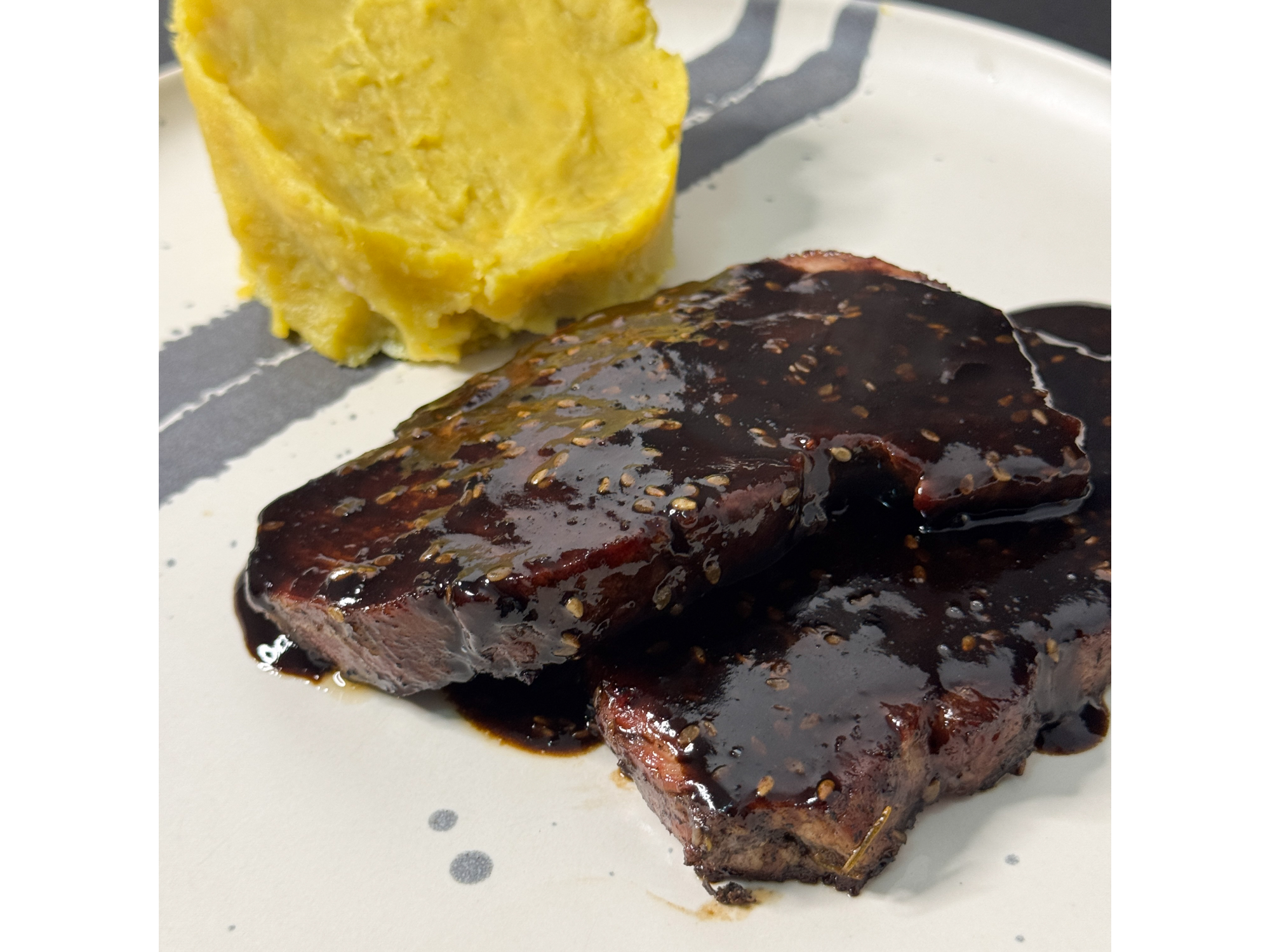 Bondiola en salsa teriyaki (220 g) + Guarnición a elecciónBondiola tierna y jugosa, con 38–40g de proteína, marinada en salsa teriyaki baja en azúcar. El toque de soja, sésamo, jengibre y un leve dulzor le da un perfil oriental que no encontrarás en otro plato del menú.$9.600 Complementos para tu pedido Agregá items adicionales a tu pedido. Guarnición a elección 1 Seleccioná una opción. Obligatorio Puré de papas (180g) El clásico, pero gourmet. Aporta entre 28 y 30g de carbohidratos. Funciona como fuente rápida de glucosa post-entreno, o como carga de energía si se lo combina con proteína magra. Puré de batatas (180g) Una fuente de carbohidratos con bajo índice glucémico y alta densidad energética (30g de carbos). Perfecto para recarga de energía pre-entreno o para etapas de volumen muscular. Puré de calabaza (200g) Liviano, cremoso, alto en fibra y con muy bajo aporte calórico (20–25g de carbohidratos por porción). Ideal para fases de definición o comidas nocturnas, ya que aporta saciedad sin sobrecargar. Vegetales salteados (200g) Mix de vegetales cocidos con mínimo aceite, cargado de fibra, agua y micronutrientes esenciales. Incluye berenjena, zucchini, zapallito y brócoli. Ideal para quienes buscan reducir calorías sin perder saciedad. Ensalada de gallina (200g) La ensalada de gallina que conoces, pero optimizada: pechuga de pollo desmenuzada, papa, zanahoria y arvejas (guisantes). Con mayonesa aparte para se la agregues al gusto. Sin stock Ensalada rusa (200g) Papa, zanahoria y arvejas frescas, con mayo aparte. Clásica, liviana y con 6 g de proteína, perfecta para acompañar tu proteína favorita. Sin stock Observaciones 0 / 150 Encontrá productos relacionados CERDOS (3)