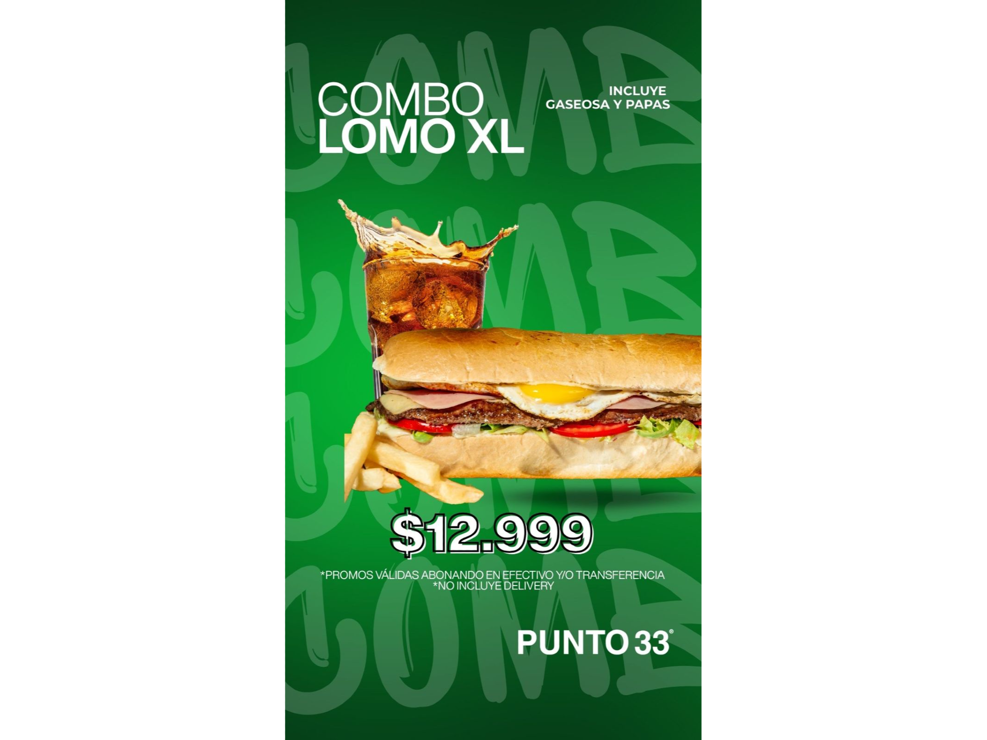 PROMOS EFF/TRANSFERENCIA Compartir por WhatsApp Copiar enlace COMBOS ZARPADAS PARA COMPARTIR X 2 LOMOS SUPER Otros COMBOS ZARPADAS (3) LOMO XL + PAPAS + GASEOSA! 🍟🍔 $18.000$12.999 28% OFF DOBLE CUARTO+ PAPAS + GASEOSA! 🍟🍔 $18.500$10.999 41% OFF LOMO MEDIANO + PAPAS + GASEOSA! 🍟🍔 $18.500$10.999 41% OFF PARA COMPARTIR X 2 (2) 2 LOMOS MEDIANOS + PAPAS + 🍟🍔 $32.000$17.500 45% OFF 2 SIMPLE CUARTO DE LIBRA+ PAPAS! 🍟🍔 $24.000$12.999 46% OFF LOMOS SUPER (3) x 2 LOMOS XL + PAPAS🍟 $40.000$22.000 45% OFF X 3 LOMOS XL COMPLETOS + PAPAS🍟 $57.000$31.500 45% OFF X 4 LOMOS XL COMPLETOS + PAPAS🍟 $75.000$40.000 47% OFF Otros (3) LOMO DE POLLO! $12.350$7.999 35% OFF BURGER DOBLE CON QUESO Y SALSA ESPECIAL 33 $14.500$9.500 34% OFF LOMO MEDIANO COMPLETO CON PAPAS $18.000$10.480 42% OFF