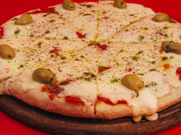 Queso mozzarella, salsa de tomate casera, oregáno, aceitunas y pesto.