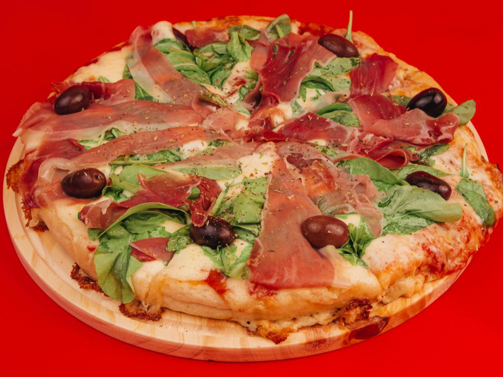 Queso mozzarella, rúcula fresca, orégano, aceite de oliva y aceitunas negras 🍕