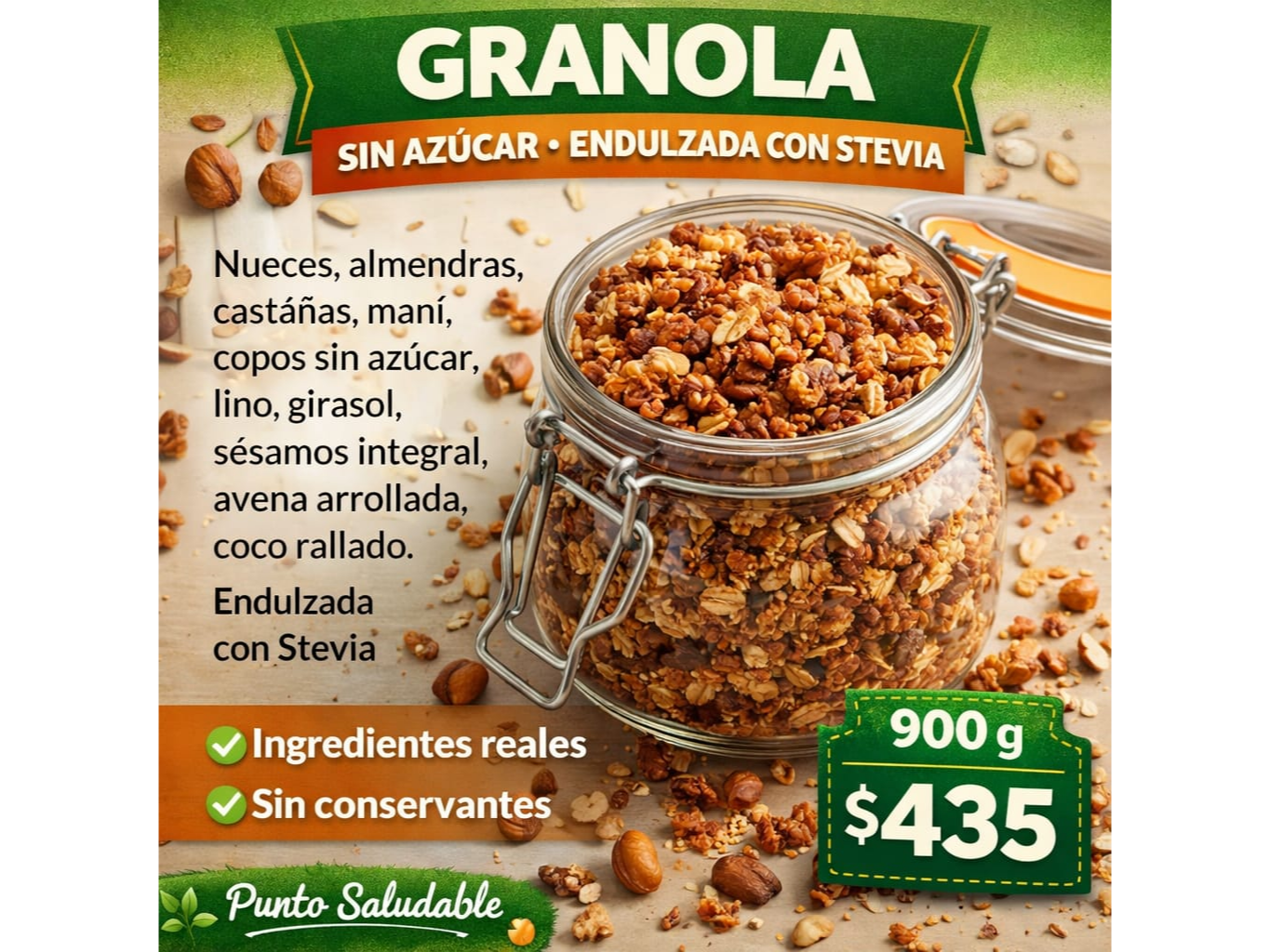 Granolas! Compartir por WhatsApp Copiar enlace Granola s/azucar endulzada con stevia 900gr $435 Granola c/pasas y azúcar 1kg $490 Granola c/pasas y azúcar 500gr $260 Granola sin azúcar sin conservantes 500gr $260 Granola Premium 500gr $310 Granola con datiles 500gr $260 Granolate 500gr $299 Muesli Natural 500gr $299