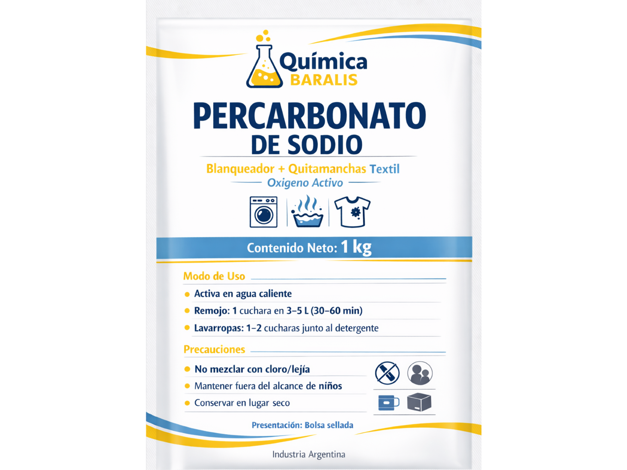 Percarbonato de Sodio. Quitamanchas Compartir por WhatsApp Copiar enlace Se recomienda colocar este producto sobre la mancha, dejar actuar aproximadamente 30 minutos y lavar la prenda como de costumbre Presentaciones Seleccioná las opciones que quieras.1/2 Kg Se activa con agua caliente, colocar una o dos cucharas en agua caliente, dejar la ropa en remojo. $7.0001 Kg$12.000 Observaciones 0 / 150