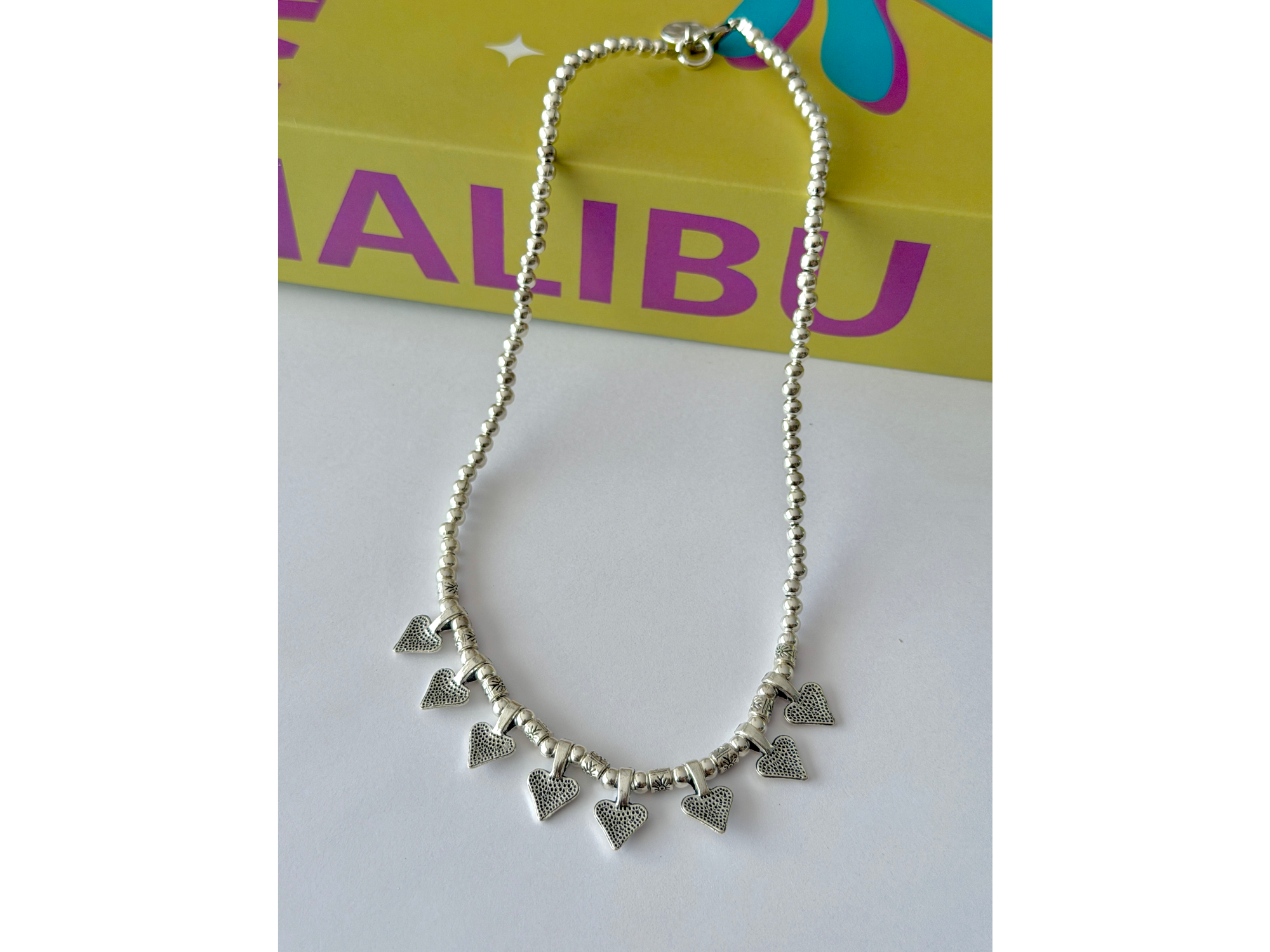 Collar Tanzania Plata Compartir por WhatsApp Copiar enlace Realizado con bolitas y dije de metal. Largo 42 cm$22.000 Observaciones 0 / 150
