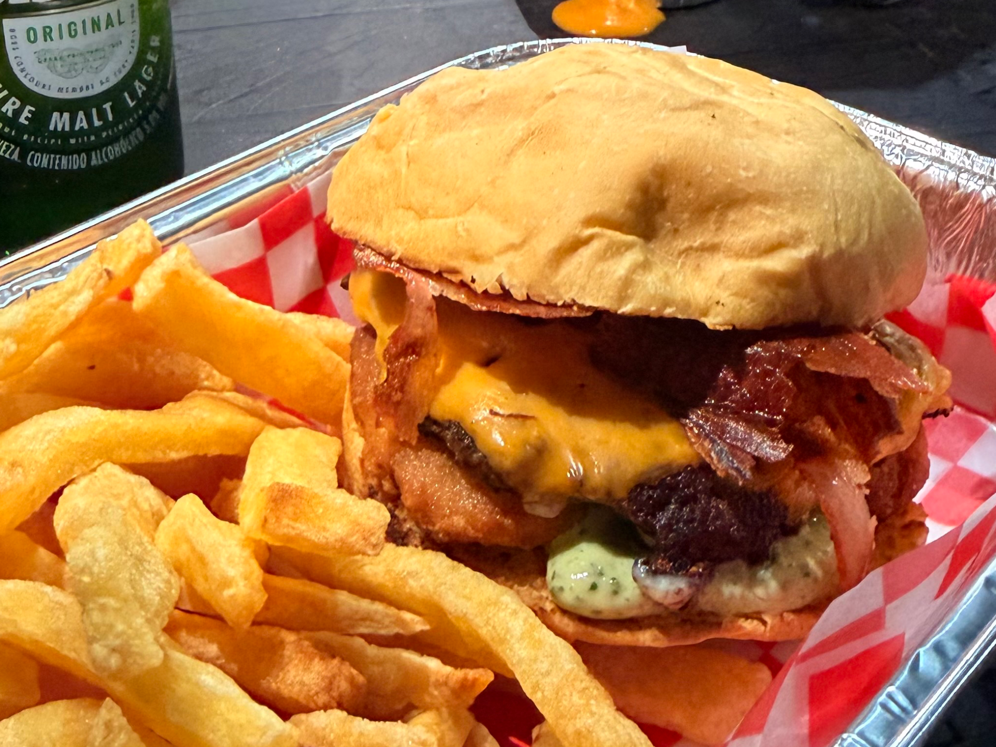 Golden Compartir por WhatsApp Copiar enlace Carne + Cheddar americano + Panceta + Aros de cebolla + Salsa ranch$13.200 Personalizá tu selección Las siguientes opciones aplican para cada producto agregado. Medallon Seleccioná una opción. Obligatorio SimpleDoble$2.900Triple$3.900 Extras Seleccioná las opciones que quieras.Pileta de cheddar$3.500 Observaciones 0 / 150