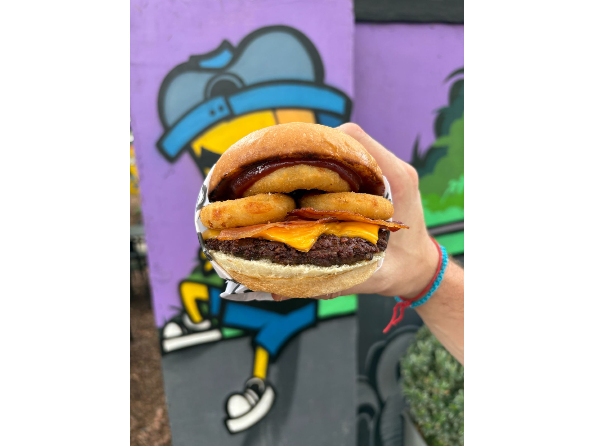 Medallón de carne de (100gr), doble cheddar, panceta crispy, barbacoa y 3 aros de cebolla. Sale con papas fritas y un pote de mayo ricaso.