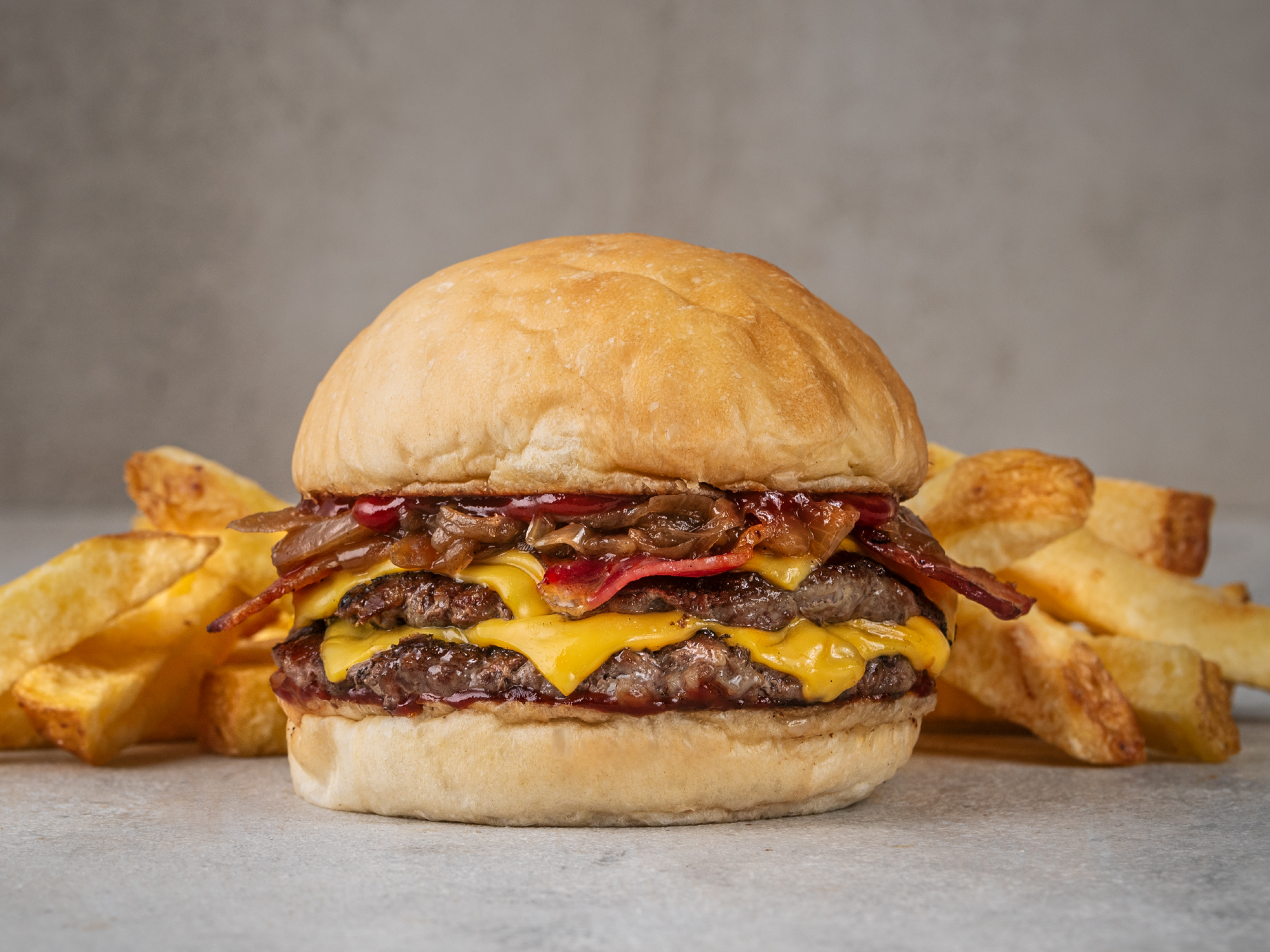 Medallón de carne (100gr), doble cheddar por medallón, panceta, cebolla caramelizada, barbacoa. Sale con papas fritas y un pote de mayo ricaso.