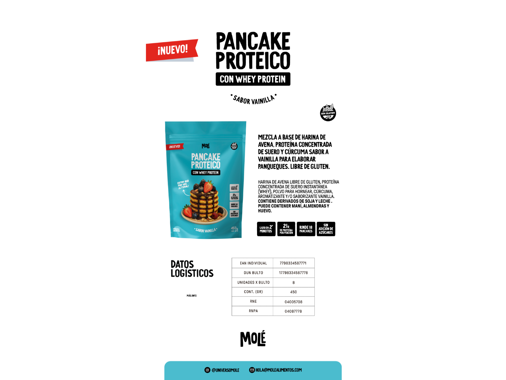 Pancake proteico Molé Vainilla Compartir por WhatsApp Copiar enlace Pancake proteico Molé sabor vainilla, rinde 18 porciones 21 grs de proteina por pancake$7.440 Observaciones 0 / 150
