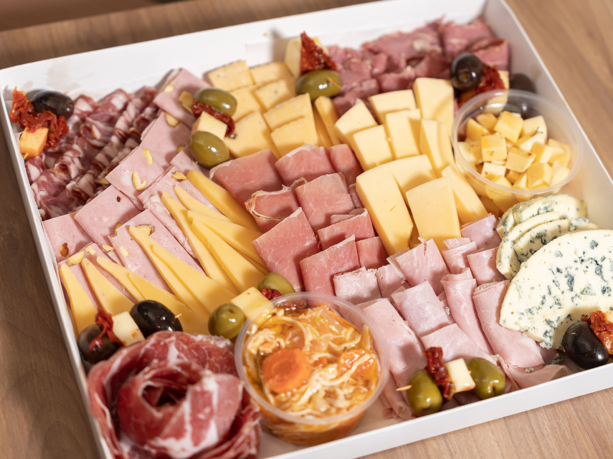 Jamon natural, mortadela con pistachos, bondiola, jamon crudo, salame sopressata, pastron, queso Fynbo, queso Pepato, queso azul, queso Mobier, quesos macerados, escabeche y aceitunas