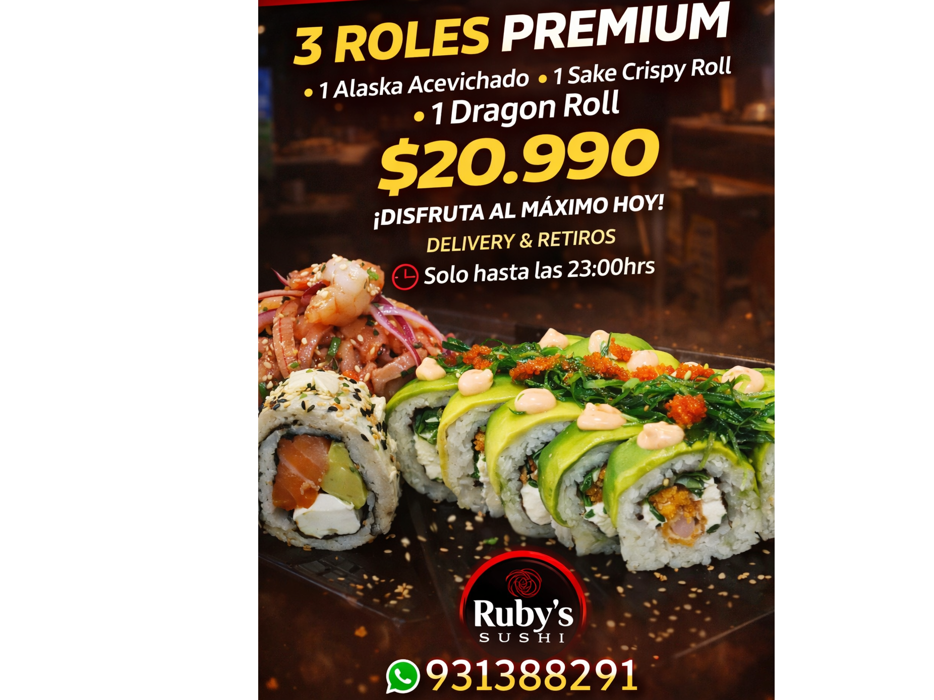 Promos premium con roles acevichados Compartir por WhatsApp Copiar enlace Promo nikkei $20.990 Promo fria de 48 piezas $23.990 Promo mixta de 60 piezas premium $25.990 Super promo XL 72 piezas $37.500
