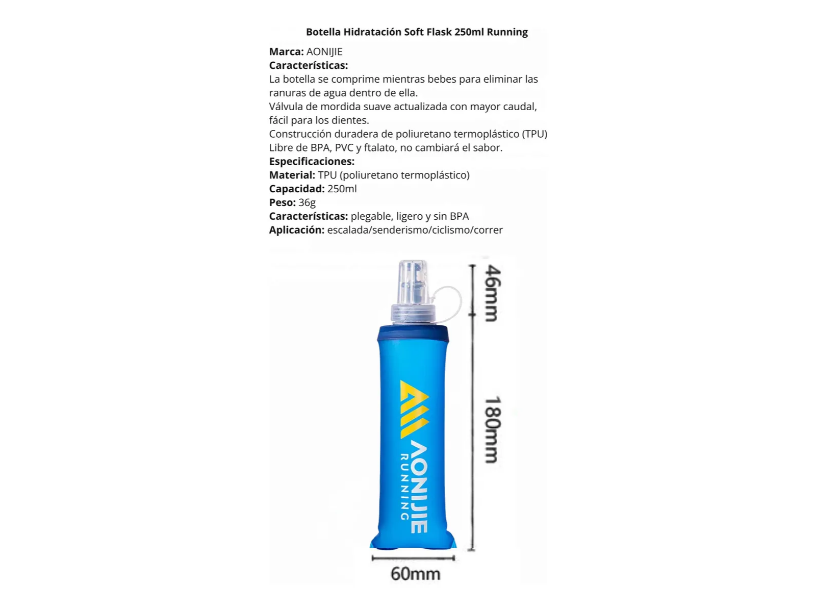 2 unidades en stock Esta botella Soft Flask deportiva está fabricada en material TPU, seguro y ecológico. Cuenta con una válvula mejorada de presión, facil y suave para accionar con los dientes. Es liviana y fácil de transportar, ideal para running y otras actividades al aire libre.