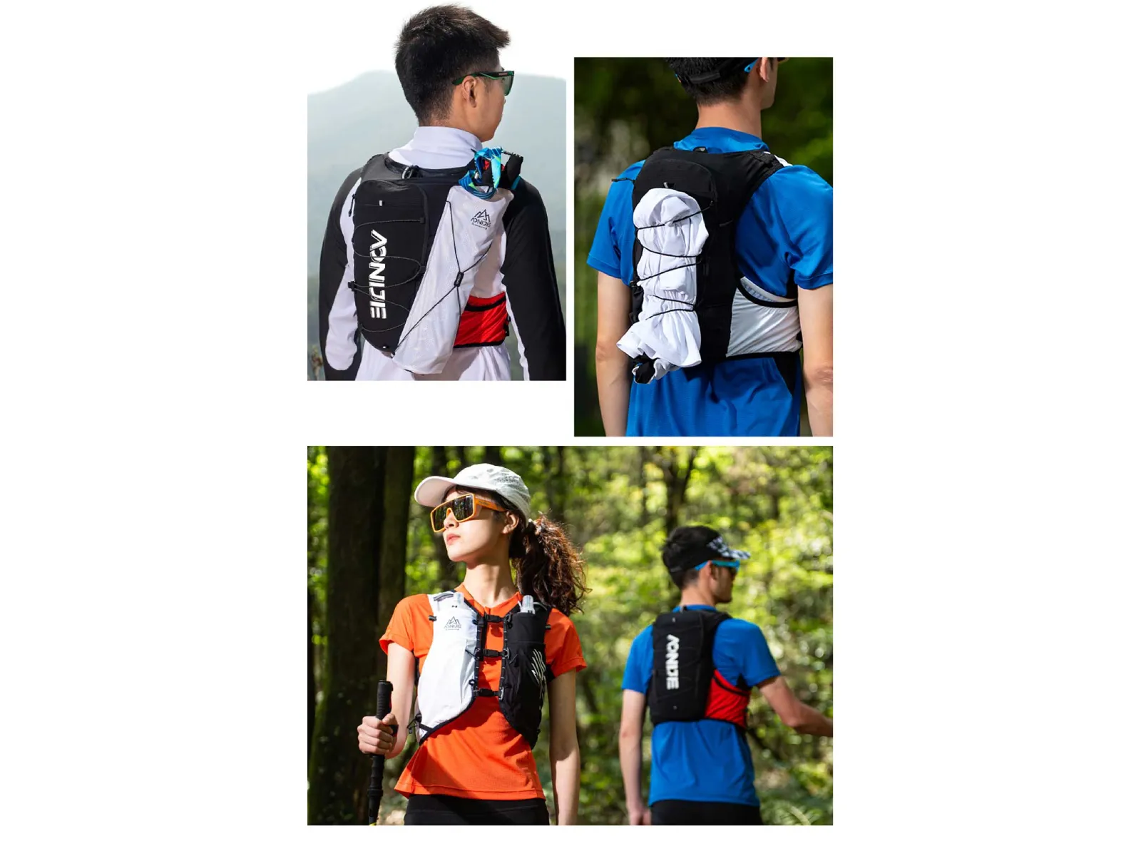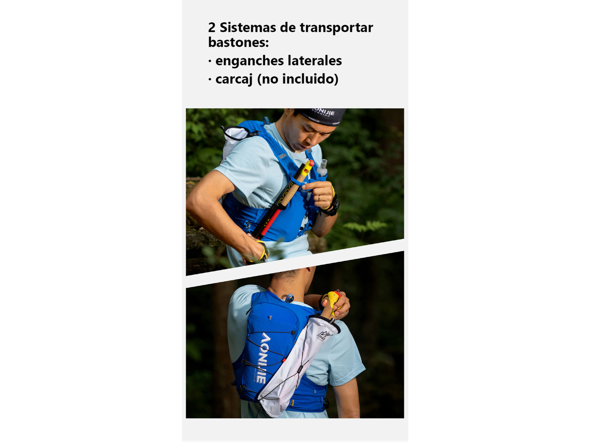 • Sistema para transportar bastones en los laterales y compatible con bolsa porta bastones de Aonijie (no incluida).