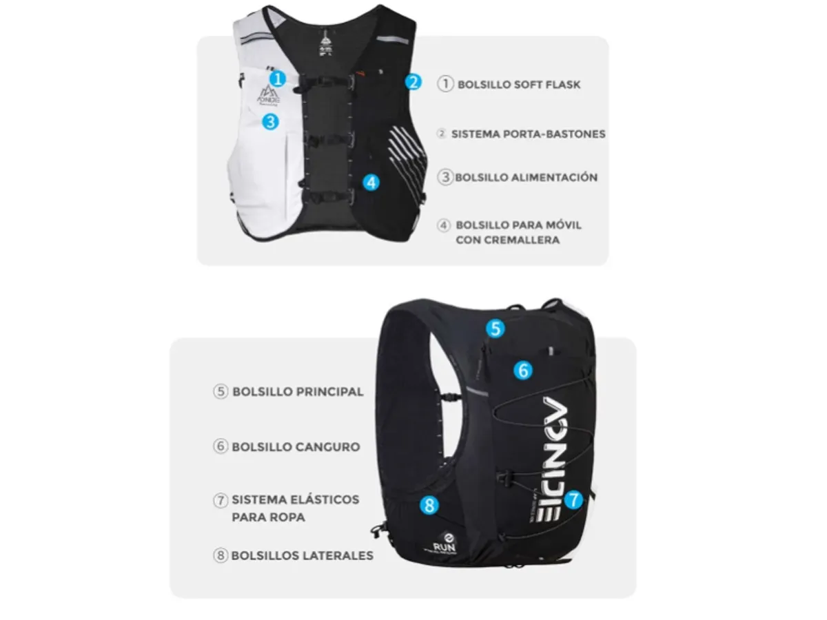 • Dos bolsillos delanteros de malla para soft flasks de 500 ml (no incluidos).