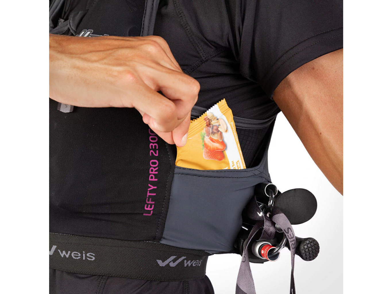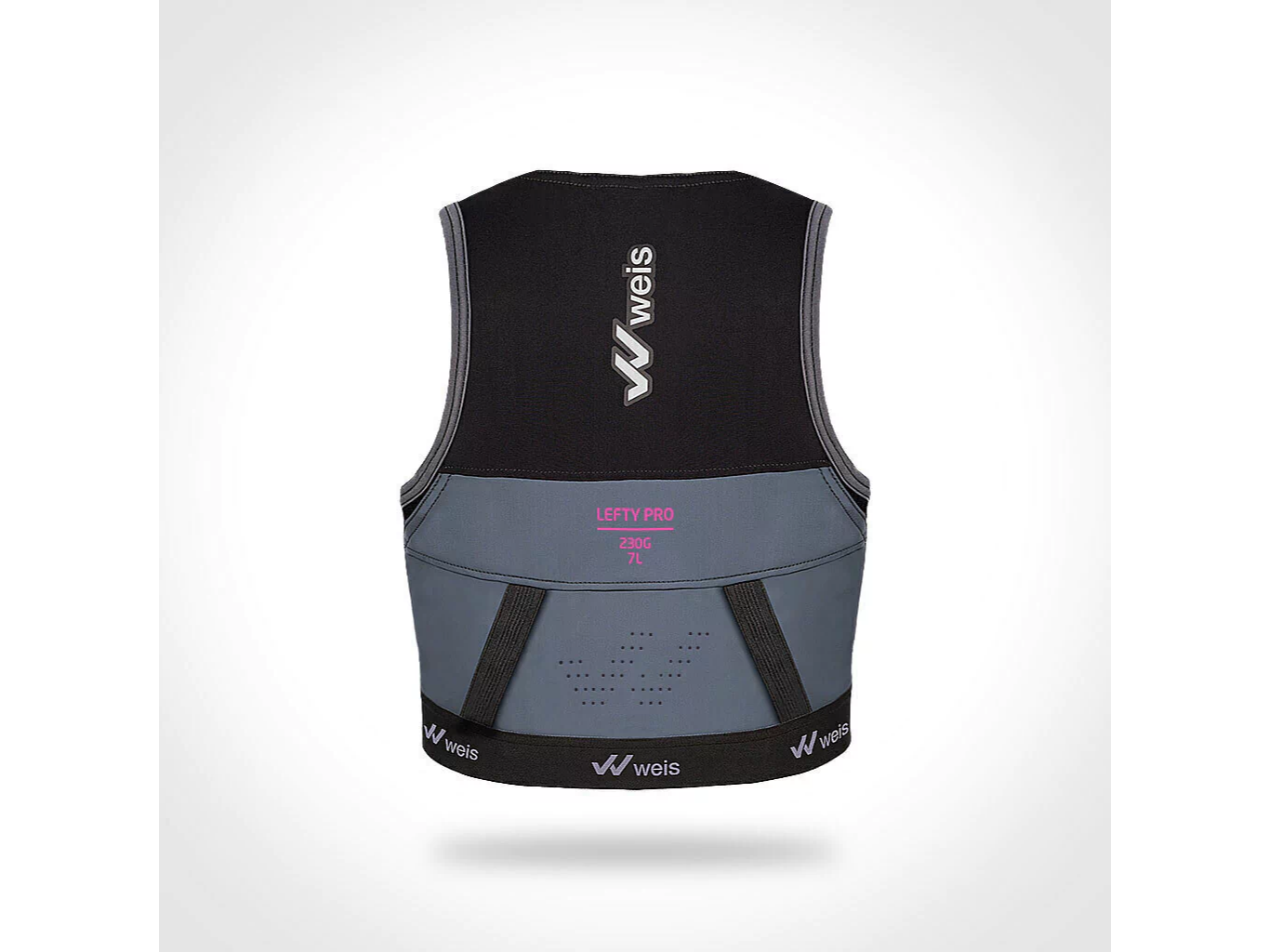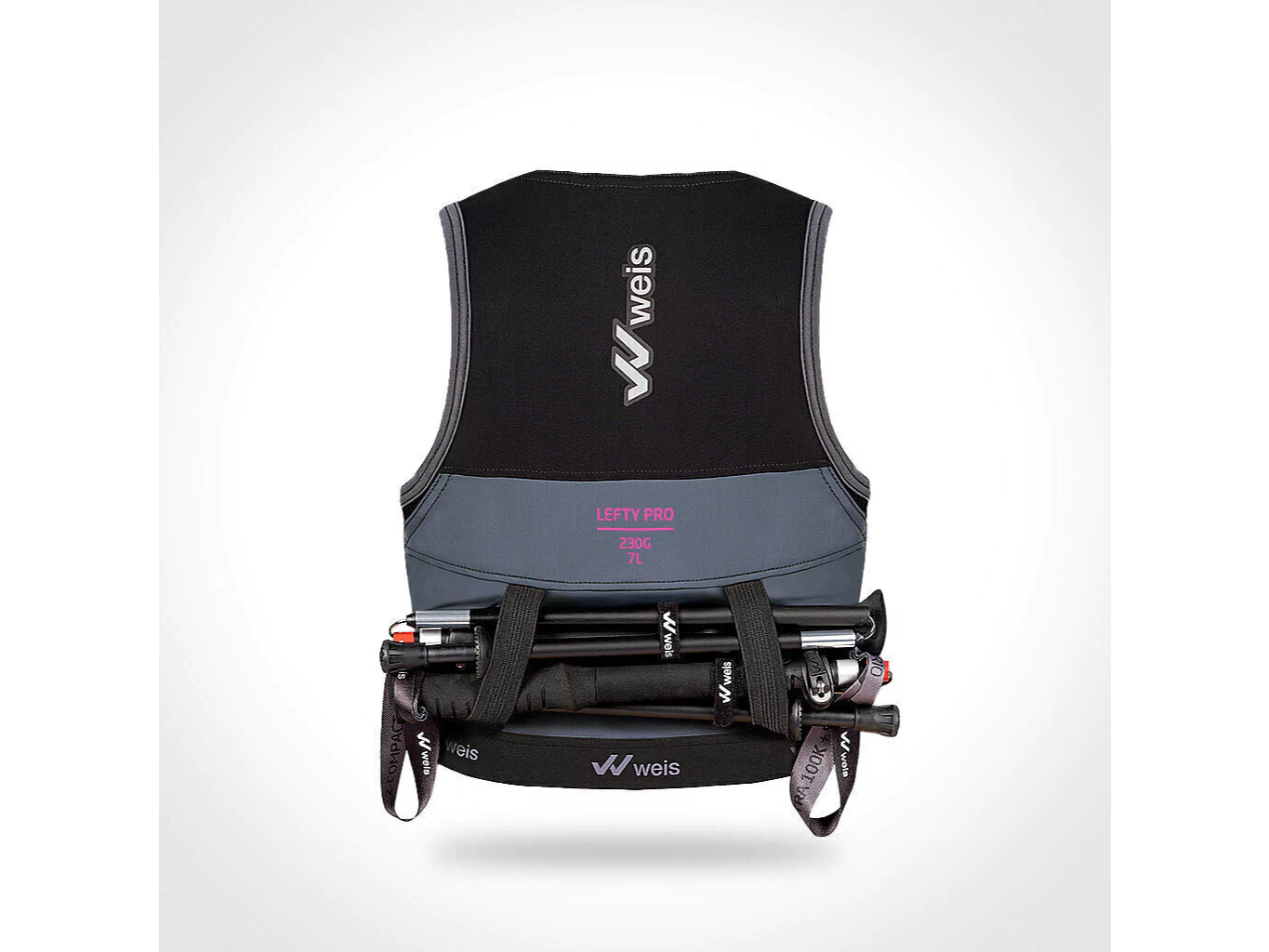 Con el chaleco LEFTY PRO 7 L. el Departamento de I+D de Weis logró crear un chaleco ultra liviano. de un material 100% transpirable y flexible. con sistema de cierre con un 40% más de capacidad frontal. que a la vez aumenta su capacidad posterior. permitiendo así la carga de todos los elementos obligatorios que exigen las carreras de largas distancias y un par de bastones.
