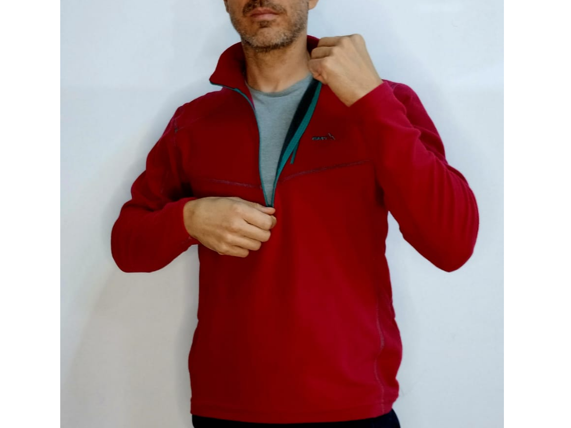 Buzo de hombre confeccionado en tela microfleece de 150gr, con cuello alto. Posee un bolsillo en el frente y un lugar en la manga para pasar el dedo pulgar.
