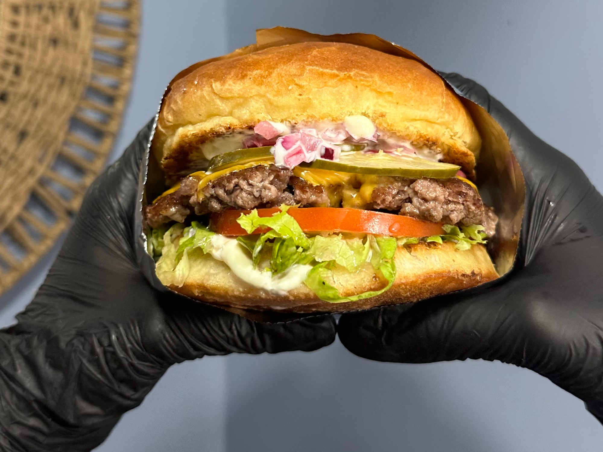 Abuusa Compartir por WhatsApp Copiar enlace Medallón de carne, cheddar x2, lechuga, tomate, cebolla morada, pepinillos, mayo casera, porción de papas y dip de mayo. Presentaciones Seleccioná las opciones que quieras.SIMPLE$9.000DOBLE$11.200TRIPLE$13.400 Complementos para tu pedido Agregá items adicionales a tu pedido. Extras Seleccioná las opciones que quieras.Extra Cheddar$1.200Extra Bacon$1.200Dip Ketchup$800Dip Mostaza$800Dip de Barbacoa$800Dip de Mayo$800Extra medallón$2.200 Observaciones 0 / 150