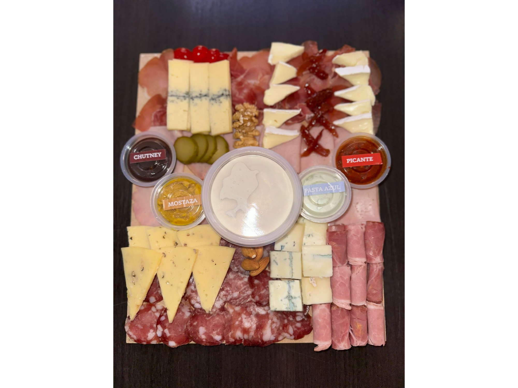 Jamón crudo,panceta Ahumada,lomo ahumado,salame premium. Queso morbier, queso gorgonzola, queso canestrato,queso brie. Dátiles, aceitunas griegas,pepinillos. Hummus,cuatro diferentes salsas,nueces, almendras,cerezas y pan de campo.