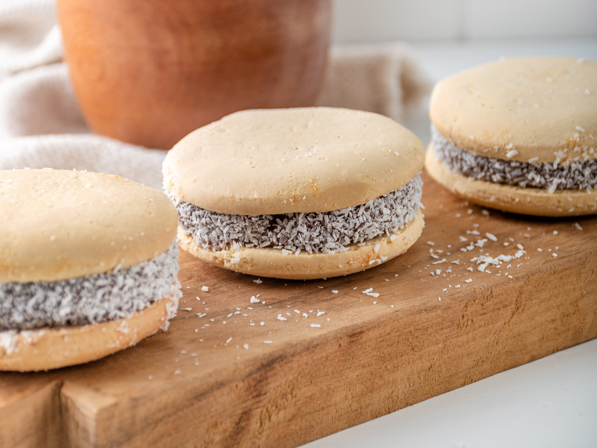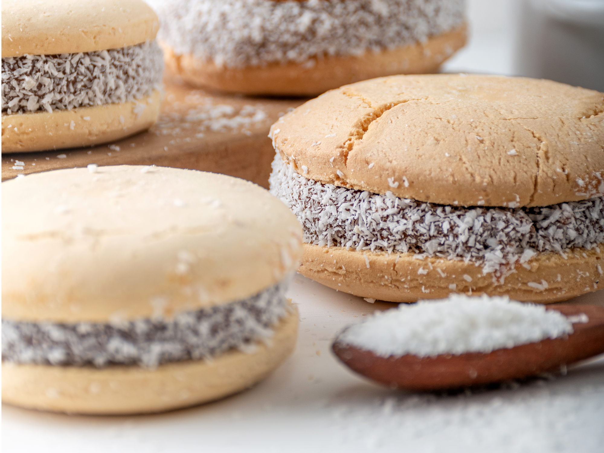 Delicados alfajores elaborados con masa suave y quebradiza a base de maicena, rellenos con dulce de leche empanizados en coco rallado. Su textura única y sabor tradicional los convierten en una opción ideal para meriendas, regalos o eventos especiales.