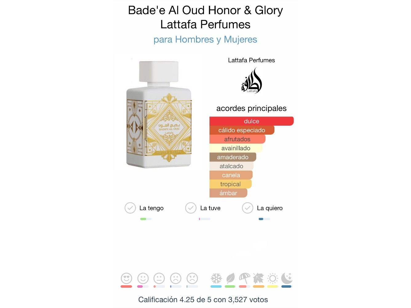 Bade’e Al Oud Honor & Glory de Lattafa es una fragancia cautivadora que combina notas dulces y especiadas, creando una experiencia olfativa inolvidable. Su aroma envolvente es perfecto para quienes buscan una esencia distintiva y con carácter.