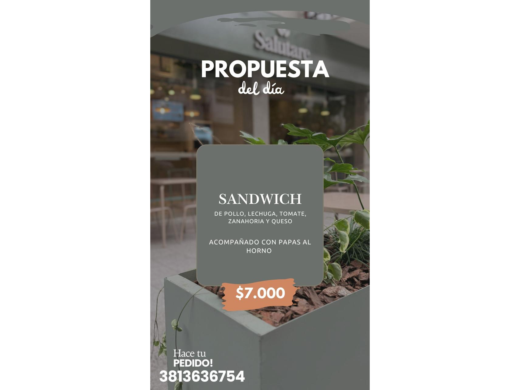 Sandwich de pollo, lechuga, tomate, zanahoria y queso. Acompañado con papas al horno. Sin stock Sandwich de pollo, lechuga, tomate, zanahoria y queso. Acompañado con papas al horno.$7.000 Personalizá tu selección Las siguientes opciones aplican para cada producto agregado. Aderezos. Seleccioná 2 opciones. Obligatorio Aceto balsamico Aceto balsamico Aderezo cesarAliño de mostaza Mostaza y miel Mayo de ajoMayo de apio Mayo de apio Mayo de paltaMayo de remolacha Mayo de remolacha Mayo picante Mayo picante Mostaza y miel Mostaza y miel Sin aderezosSin aderezos Observaciones 0 / 150