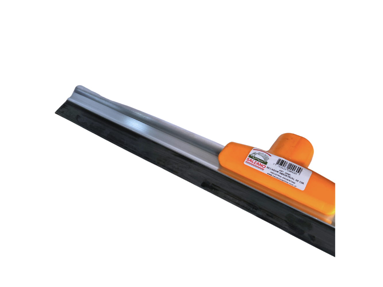 Secador de goma montado sobre una estructura de aluminio de 60 cm, utilizado para la eliminación de líquidos en superficies planas. Su diseño ligero y resistente facilita su manejo, mientras que la goma asegura una remoción eficiente de agua sin dañar las superficies.