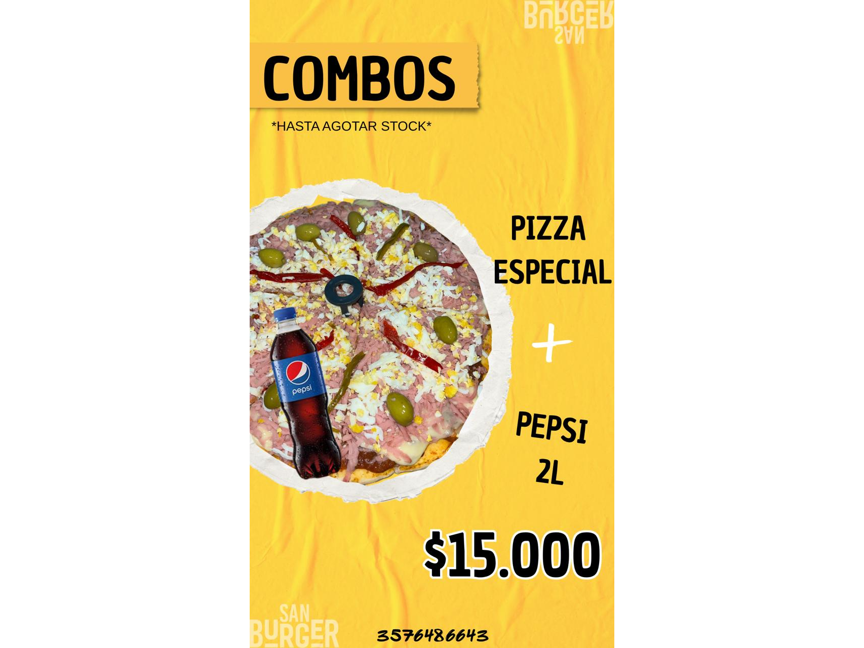 COMBOS Compartir por WhatsApp Copiar enlace PIZZA ESPECIAL + PEPSI 2L $15.000 LOMO CLASICO + PAPAS + POLLO CRISPY + BEBIDA $25.000 CHEDDAR DOBLE + PAPAS + POLLO CRISPY + BEBIDA $23.000