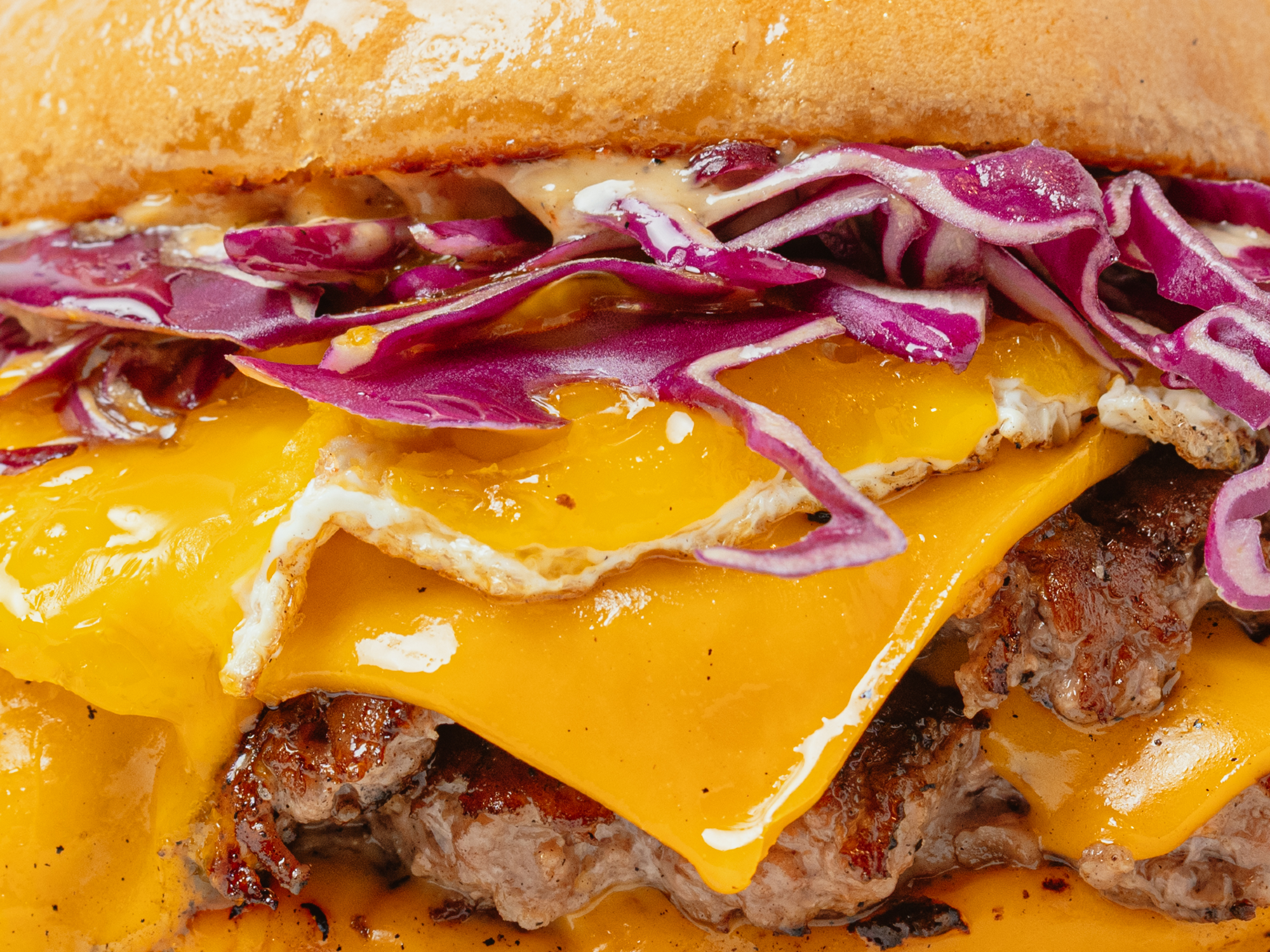 Medallón smash de 100g, queso cheddar, huevo, repollo morado y salsa picante. Incluye papas fritas.