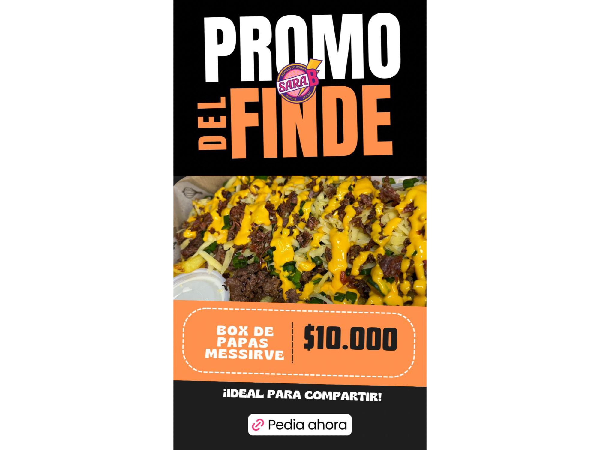 BOXMESSIRVE XXLIdel para compartir super abundante!!! Papas fritas, carne, queso cheddar y parmesano rallado... Ceb verdeo mas dos dip de mayo casera para acompañar!$14.000 Observaciones 0 / 150