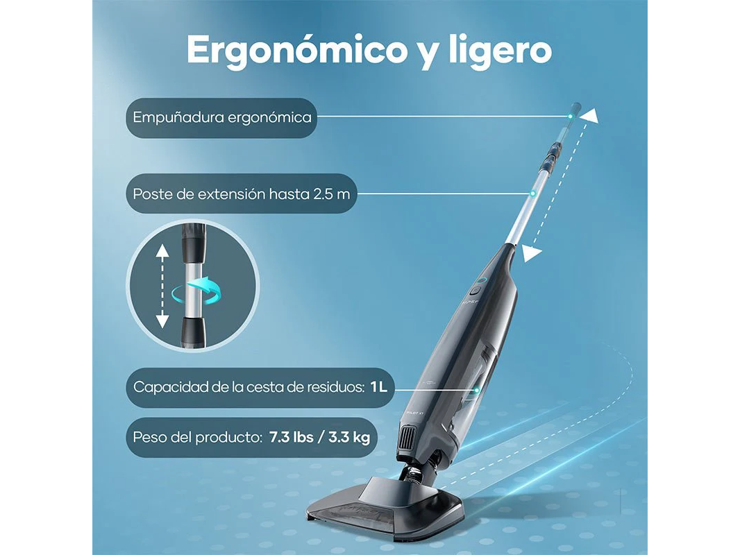 - Mástil extensible y cabezal flexible: el mástil extensible de 2,5 m (8,3 pies) llega con facilidad a las zonas de difícil acceso, mientras que el cabezal flexible se adapta perfectamente a los bordes, esquinas y curvas para una limpieza exhaustiva de extremo a extremo.