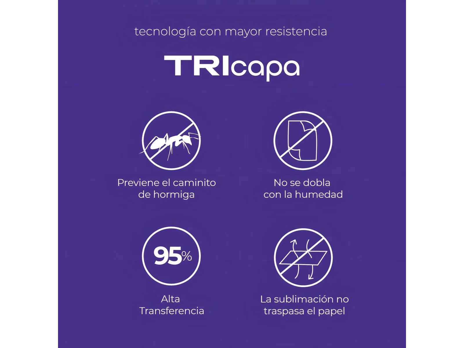 - Características: Papel encapado únicamente para sublimar, tecnología tricapa, mayor resistencia, previene el caminito de hormiga, no se dobla, no es sensible a la humedad,